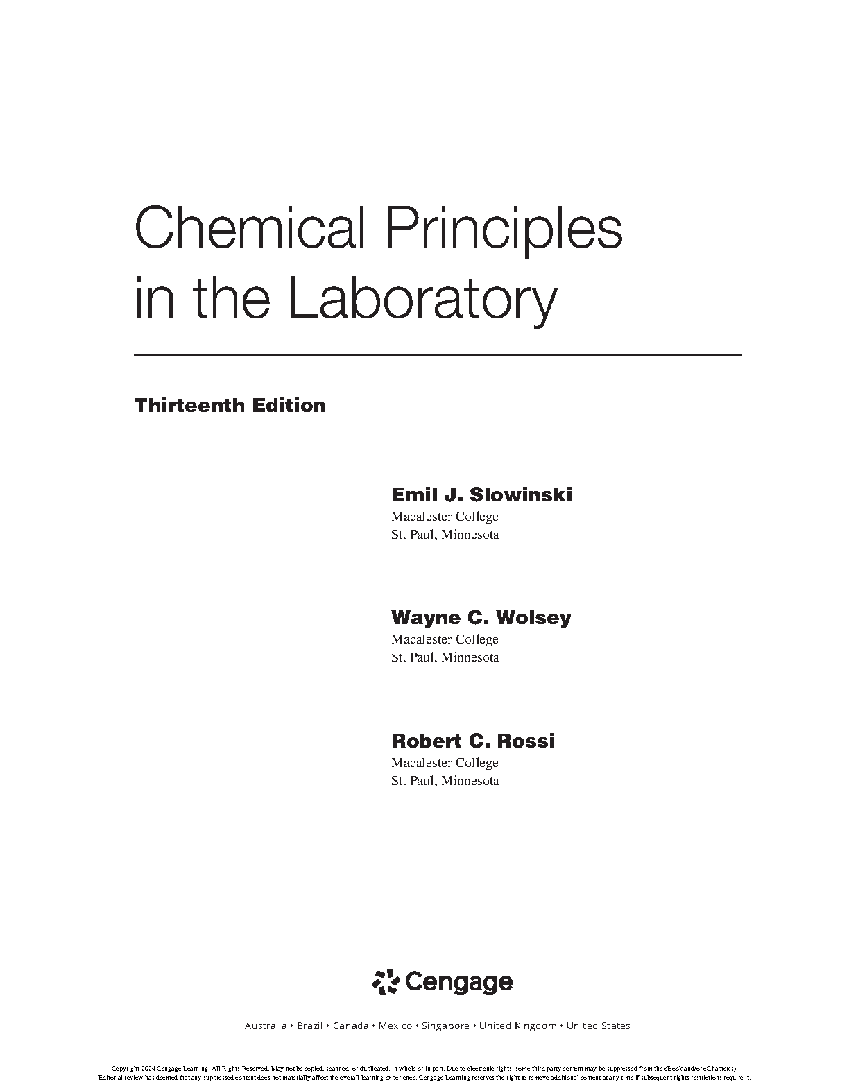 Chemical Principles in the Laboratory, Thirteenth Edition by Emil J. Slowinski, Wayne C. Wolsey, and Robert C. Rossi