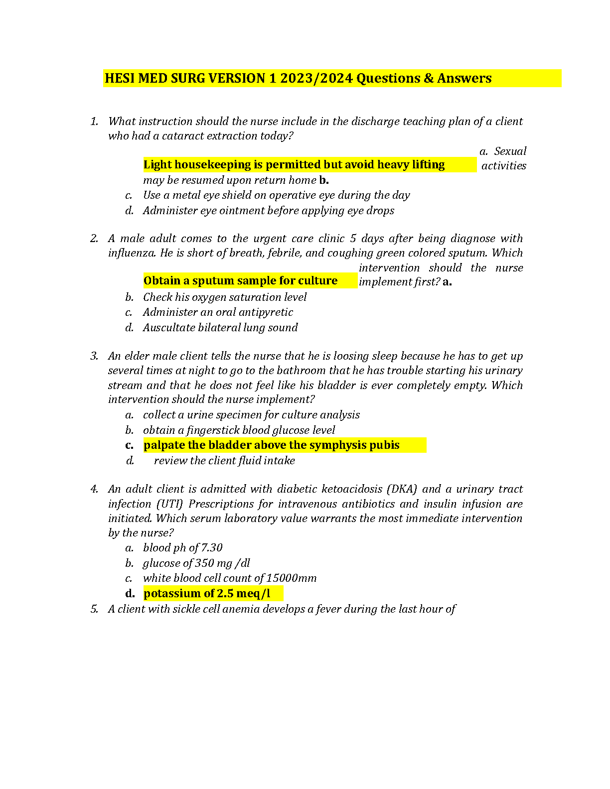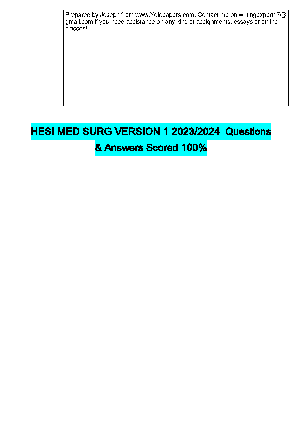 HESI Med Surg Version 1 2023/2024 Questions & Answers by Joseph - 100% Scored