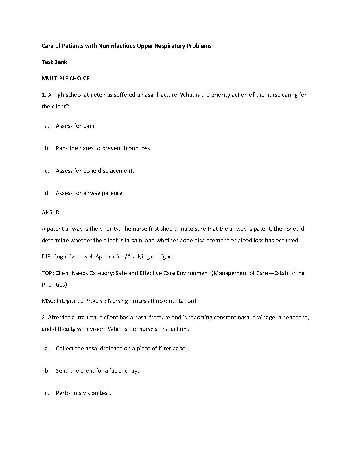 Care of Patients with Noninfectious Upper Respiratory Problems Test Bank: A 2024-2025 Edition for Nursing Students