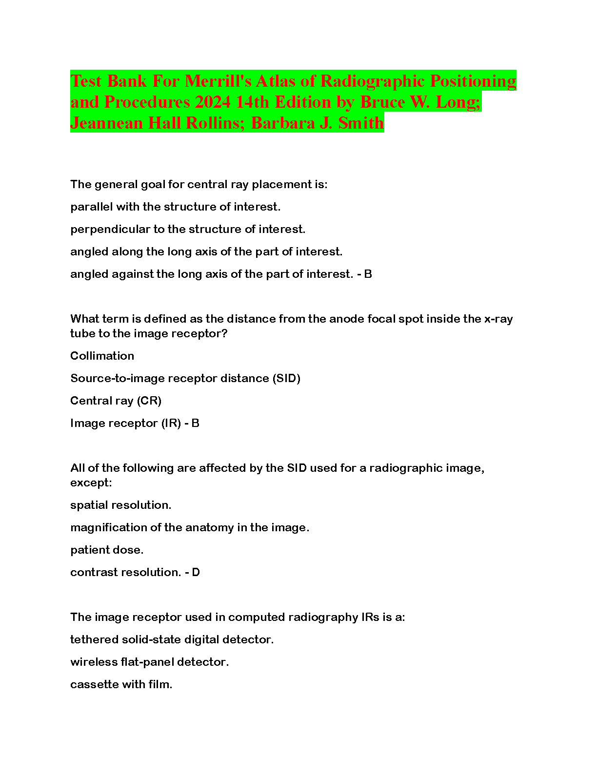 Merrill's Atlas of Radiographic Positioning and Procedures 2024 14th Edition Test Bank - Bruce W. Long, Jeannean Hall Rollins, Barbara J. Smith