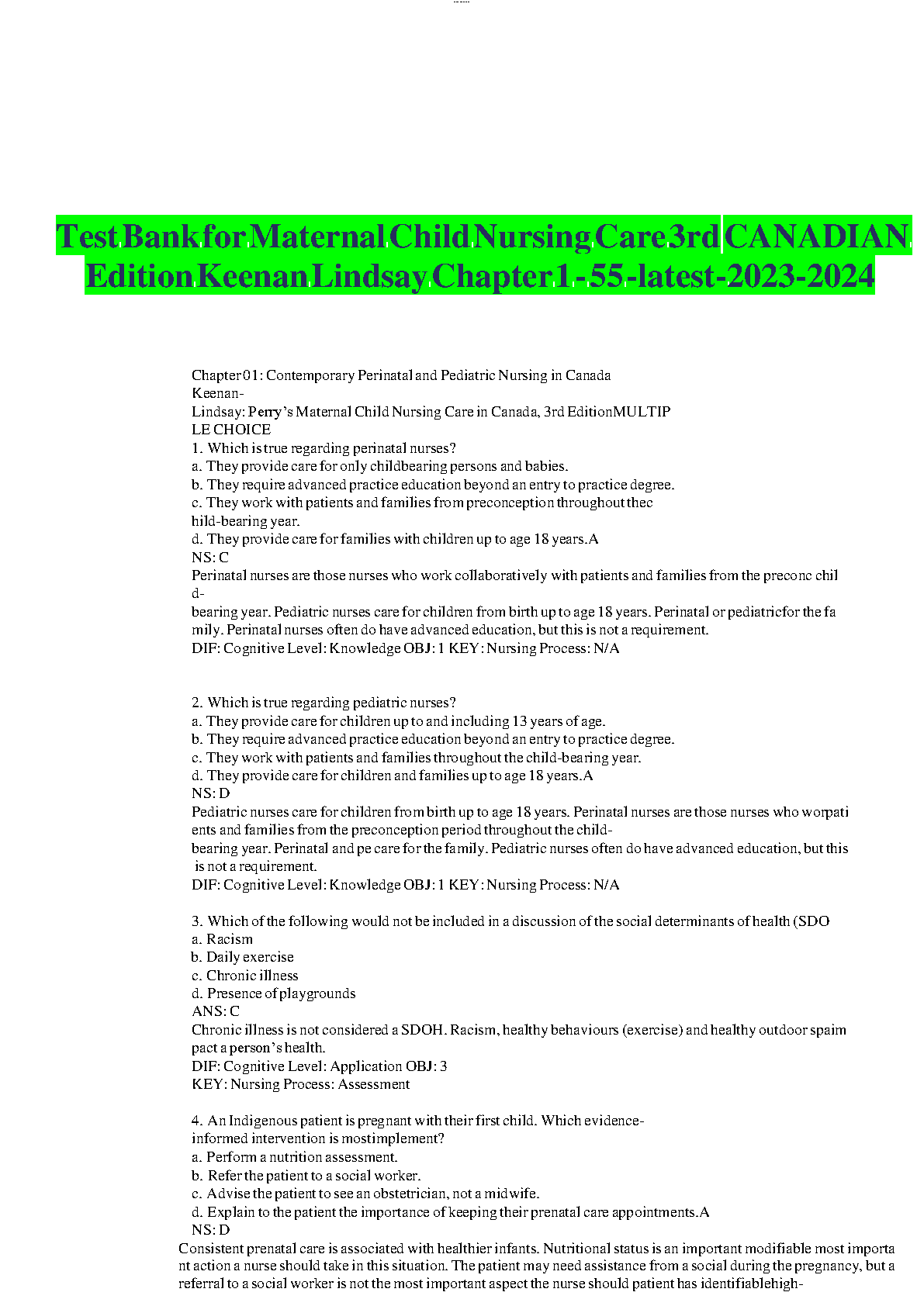This comprehensive test bank covers all chapters (1-55) of Perry's Maternal Child Nursing Care, 3rd Canadian Edition by Keenan and Lindsay. Designed to help students master the material and pass their exams on the first try, this resource provides a wealth of practice questions and answers to reinforce learning and identify knowledge gaps. Ideal for the 2024-2025 academic year.