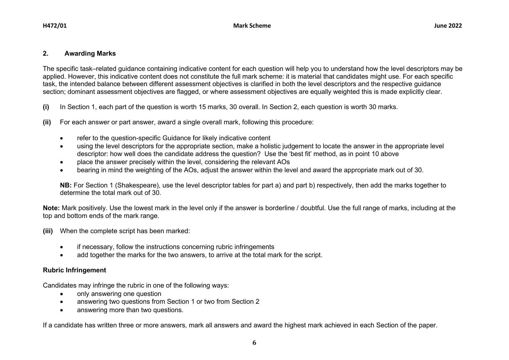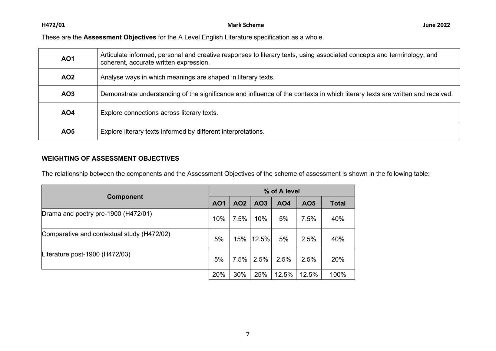 OCR A LEVEL ENGLISH LITERATURE PAPER 1 JUNE 2022 MARK SCHEME (H472/01: Drama and poetry pre-1900)