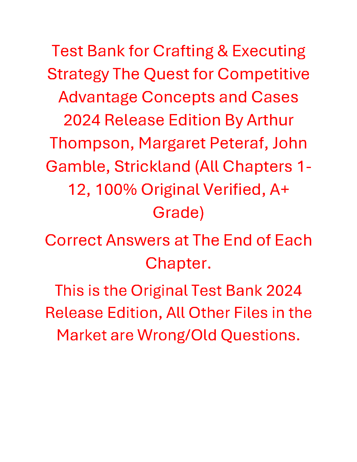2024 Test Bank: Crafting & Executing Strategy - The Quest for Competitive Advantage by Arthur Thompson, Margaret Peteraf, John Gamble, and Strickland