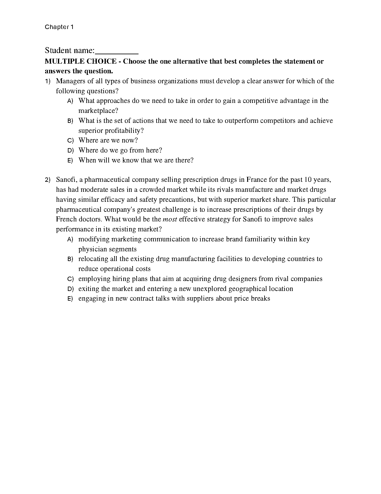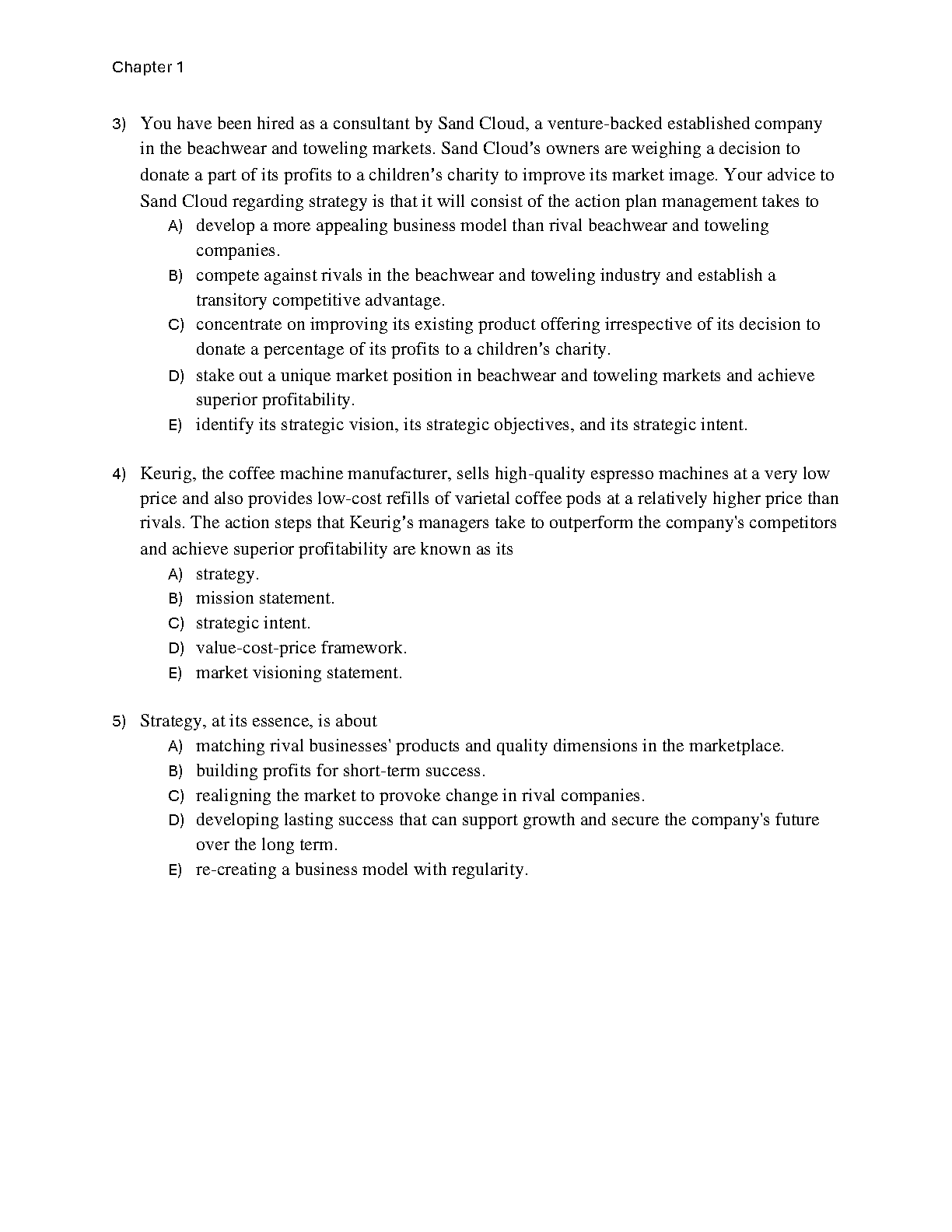 Ace your exams with this 2024 release edition test bank for Crafting & Executing Strategy: The Quest for Competitive Advantage by Arthur Thompson, Margaret Peteraf, John Gamble, and Strickland. This comprehensive resource includes all chapters (1-12) with 100% original, verified answers. Get the A+ grade you deserve – avoid resits with our updated, accurate questions.