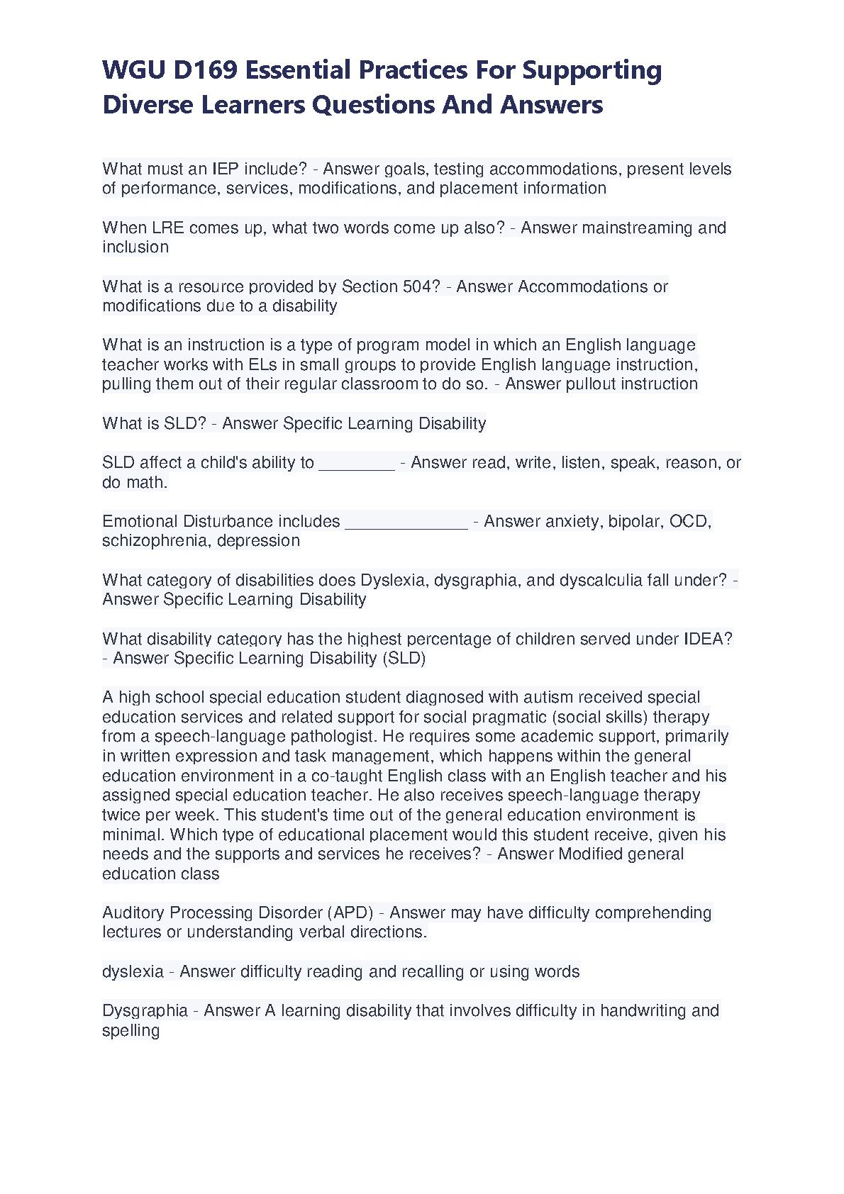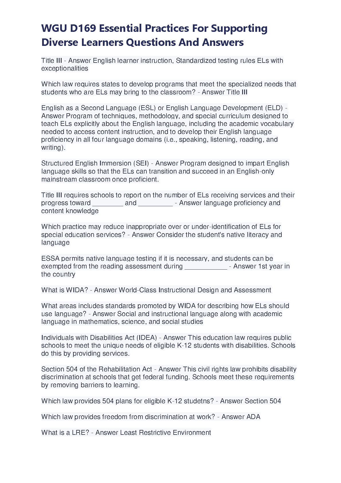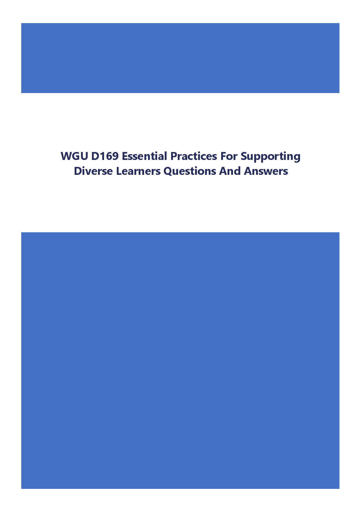 Ace your WGU D169 exam on your first try with this comprehensive question and answer resource. This updated 2024-2025 edition covers all essential practices for supporting diverse learners, ensuring you're fully prepared for exam success and avoiding costly resits. Gain confidence and master the key concepts needed to excel in your studies.
