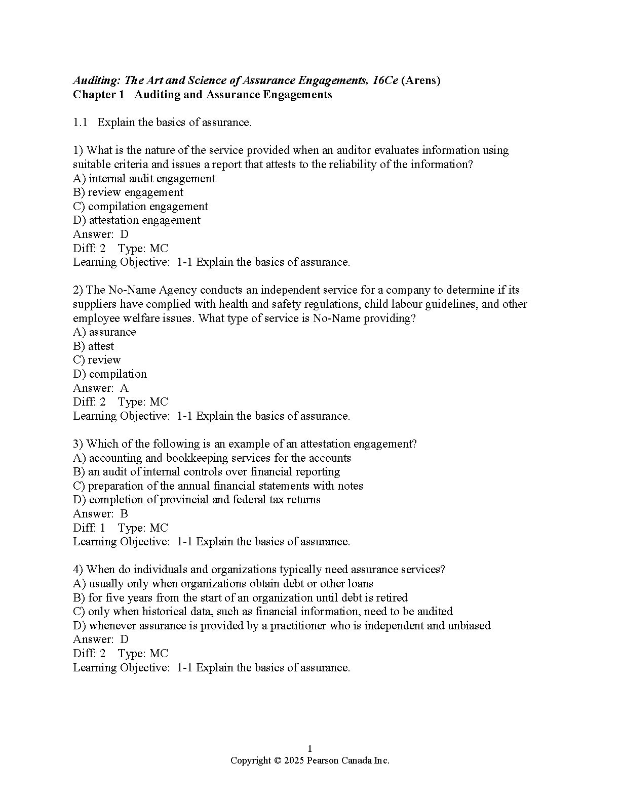 Auditing: The Art and Science of Assurance Engagements, 16Ce (Arens, Elder, Beasley) - Test Bank