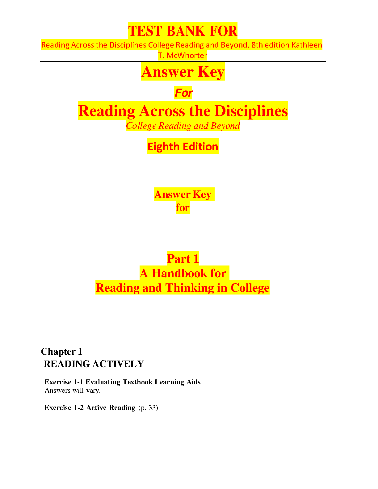 Test Bank for Reading Across the Disciplines: College Reading and Beyond, 8th Edition by Kathleen T. McWhorter