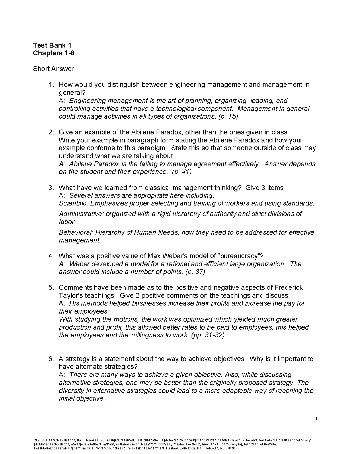 Ace your Engineering Management exams with this comprehensive Test Bank, covering Chapters 1-8. This resource provides short answer questions and detailed explanations to help you master key concepts and avoid resits. Ideal for the 2024/2025 academic year.