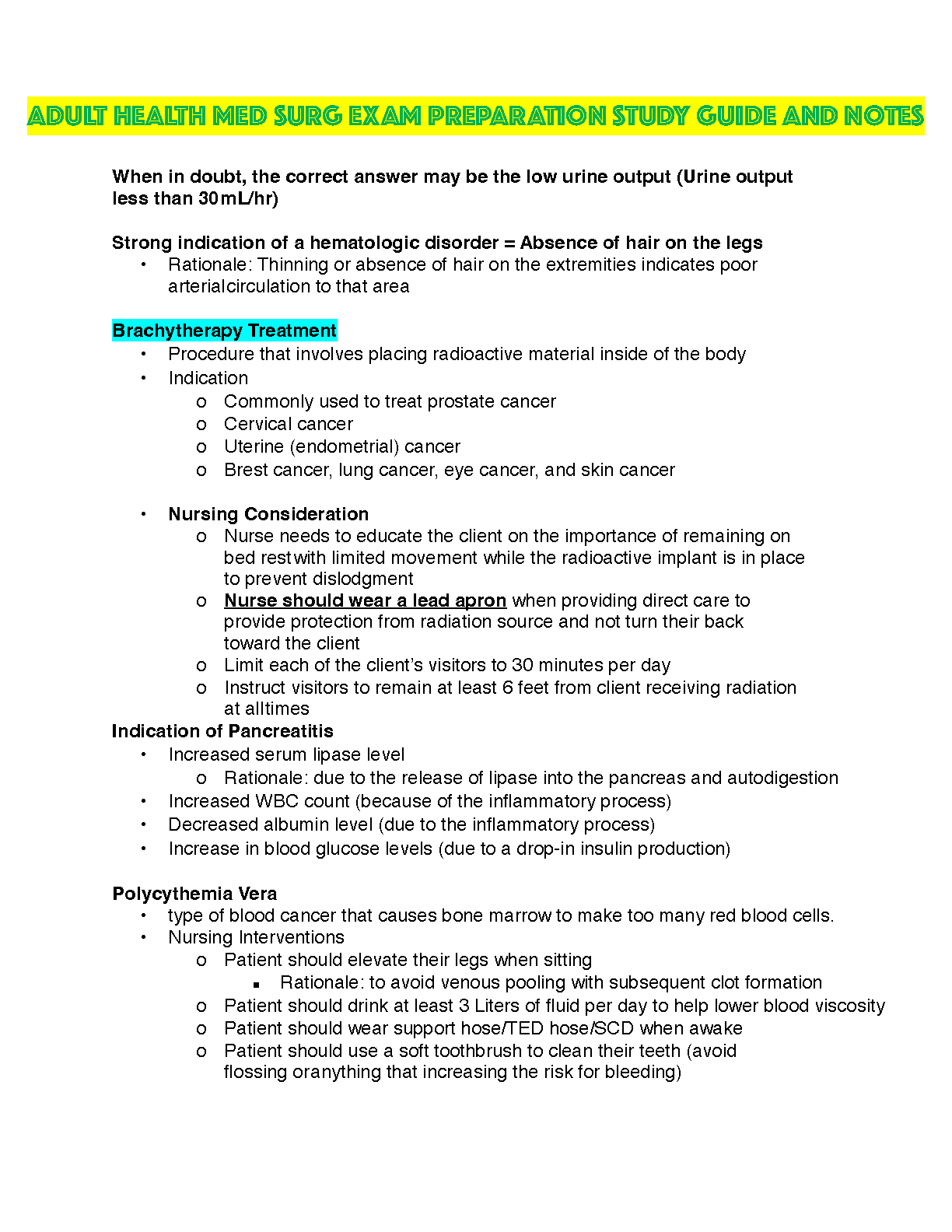 Ace your Adult Health Med Surg exams on your first try with this comprehensive study guide and notes, perfect for the 2024-2025 academic year. This resource covers key concepts, including Brachytherapy Treatment, Pancreatitis, and Polycythemia Vera, providing clear explanations and nursing considerations to ensure exam success and avoid resits.