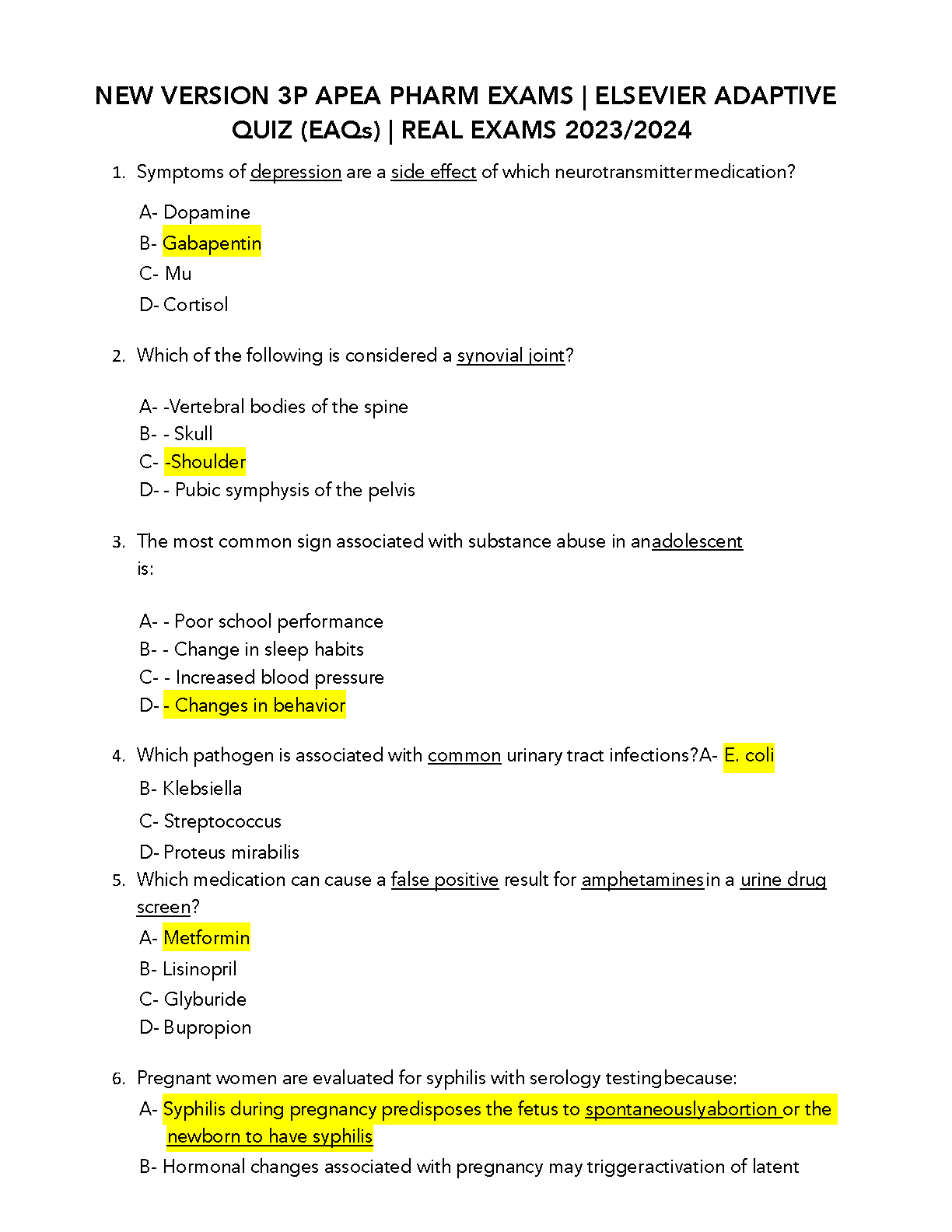 Ace your 2024-2025 APEA Pharmacology exams with this comprehensive study guide. This resource includes Elsevier adaptive quizzes (EAQs) and real exam questions to help you master the material and avoid resits. Prepare effectively for success!