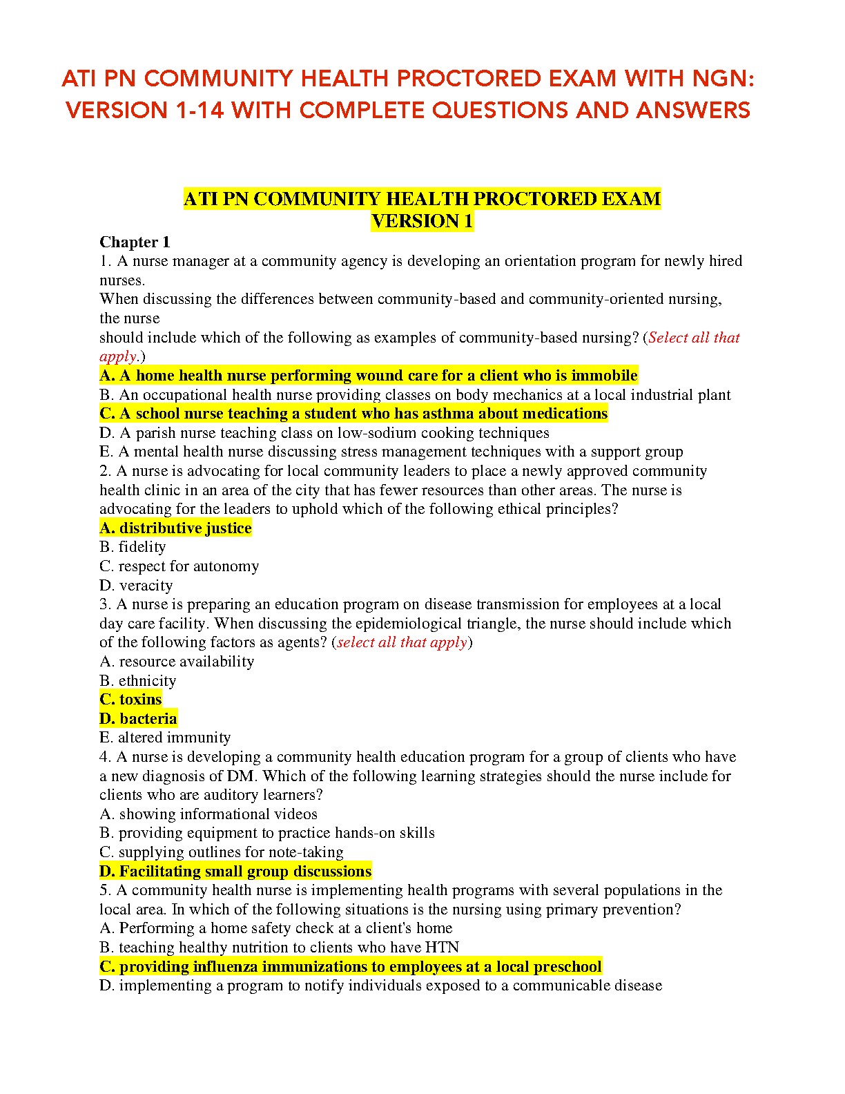 Ace your ATI PN Community Health Proctored Exam (Version 1-14) on the first try! This comprehensive guide provides complete questions and answers, ensuring exam readiness and success. Avoid resits with our in-depth study material.