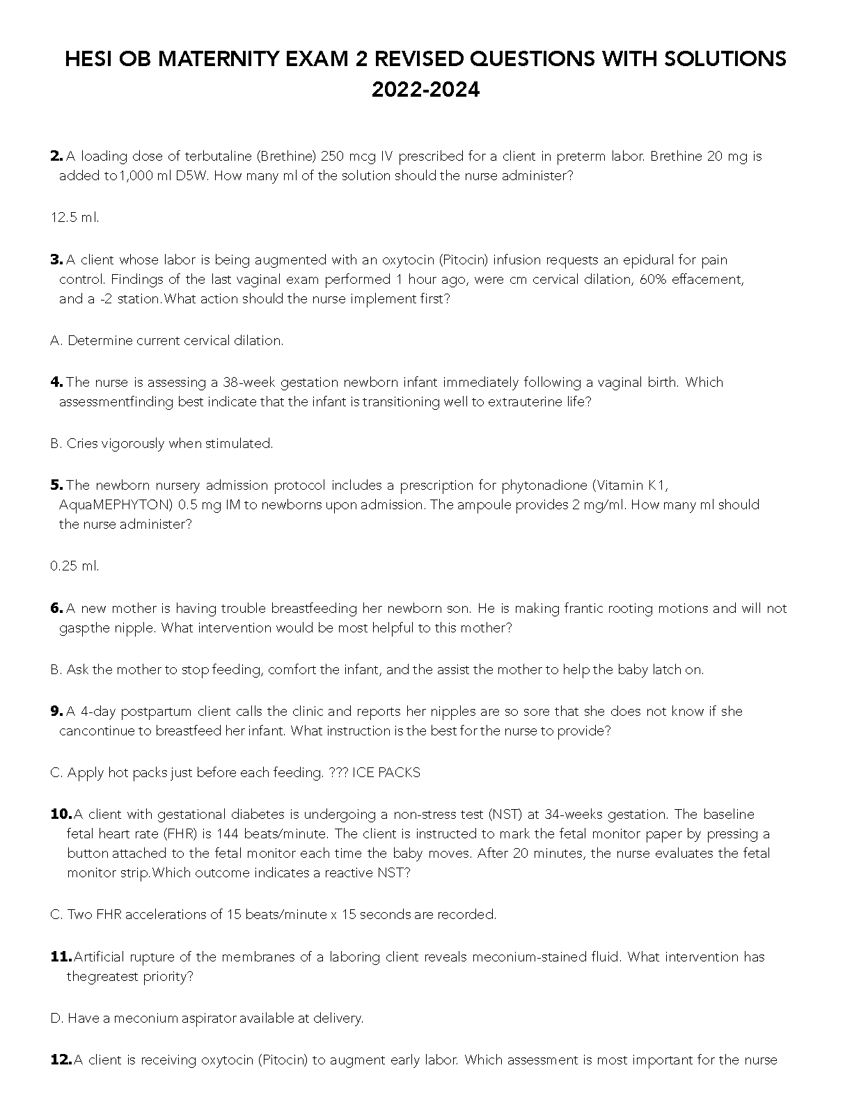HESI OB Maternity Exam 2 Revised Questions with Solutions 2022-2024: Ace Your Exam with This Comprehensive Guide