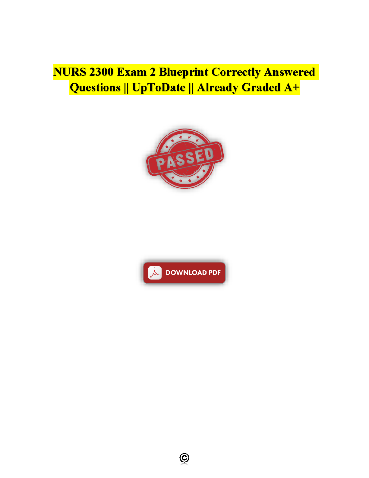 Ace your NURS 2300 Exam 2 with this comprehensive blueprint containing correctly answered questions. Up-to-date and already graded A+, this resource is designed to help you pass your exam on the first try, avoiding costly resits. Get the edge you need for exam success!