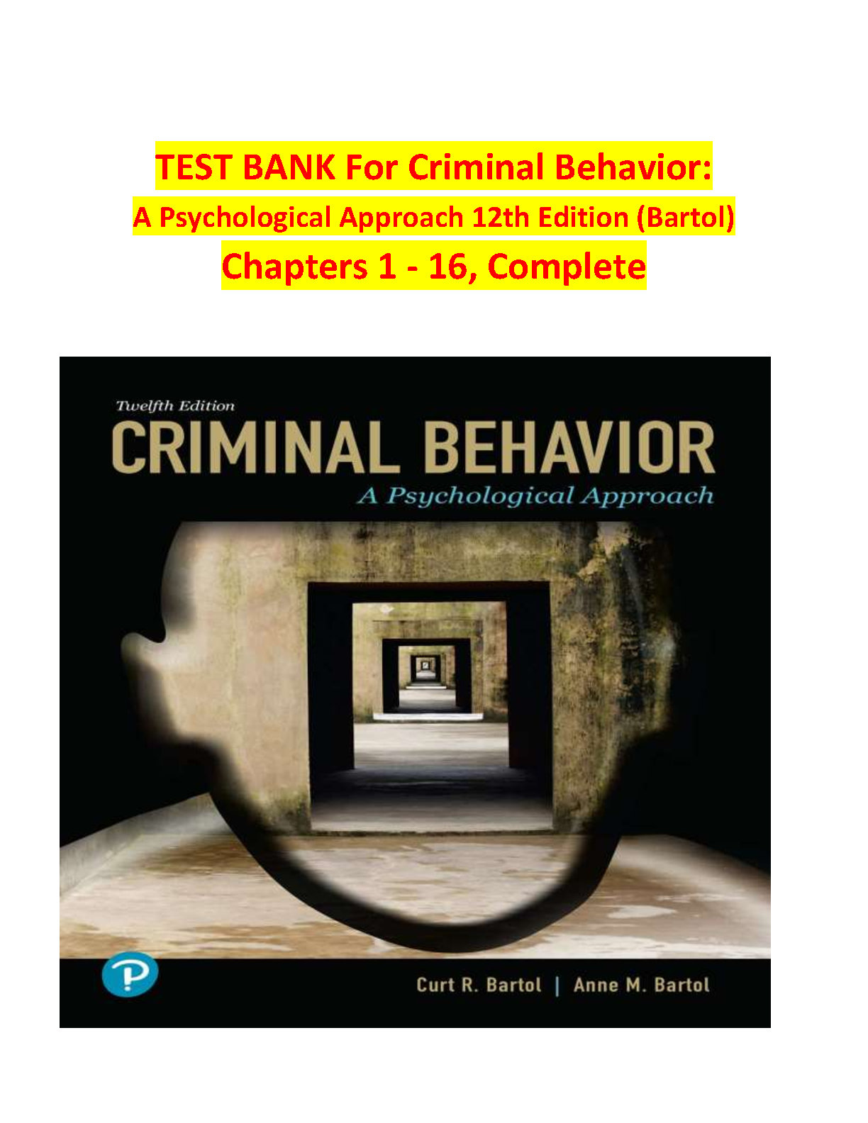Complete test bank for Criminal Behavior: A Psychological Approach, 12th Edition, by Curt R. Bartol and Anne M. Bartol, covering chapters 1-16. This resource is designed to help students master the material and ace their exams on the first try, avoiding the need for resits.