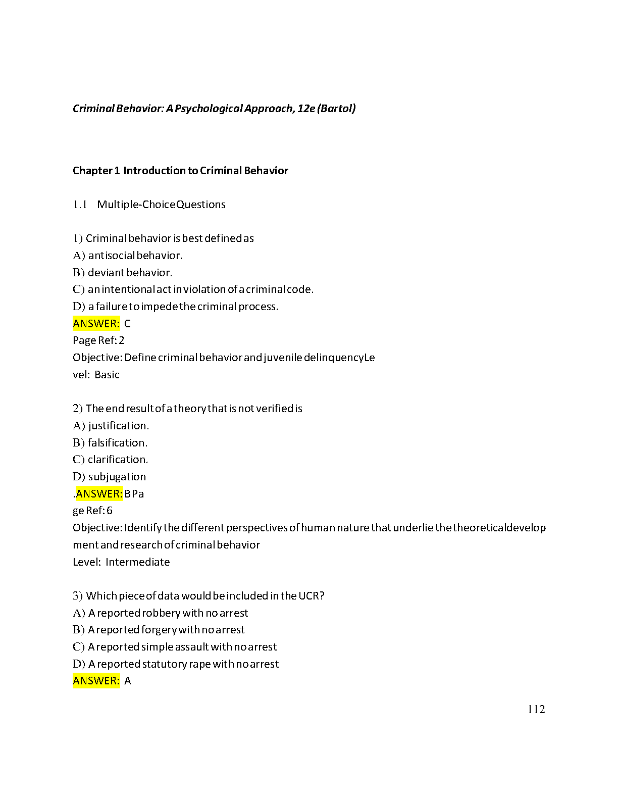 Test Bank for Criminal Behavior: A Psychological Approach, 12th Edition by Curt R. Bartol and Anne M. Bartol