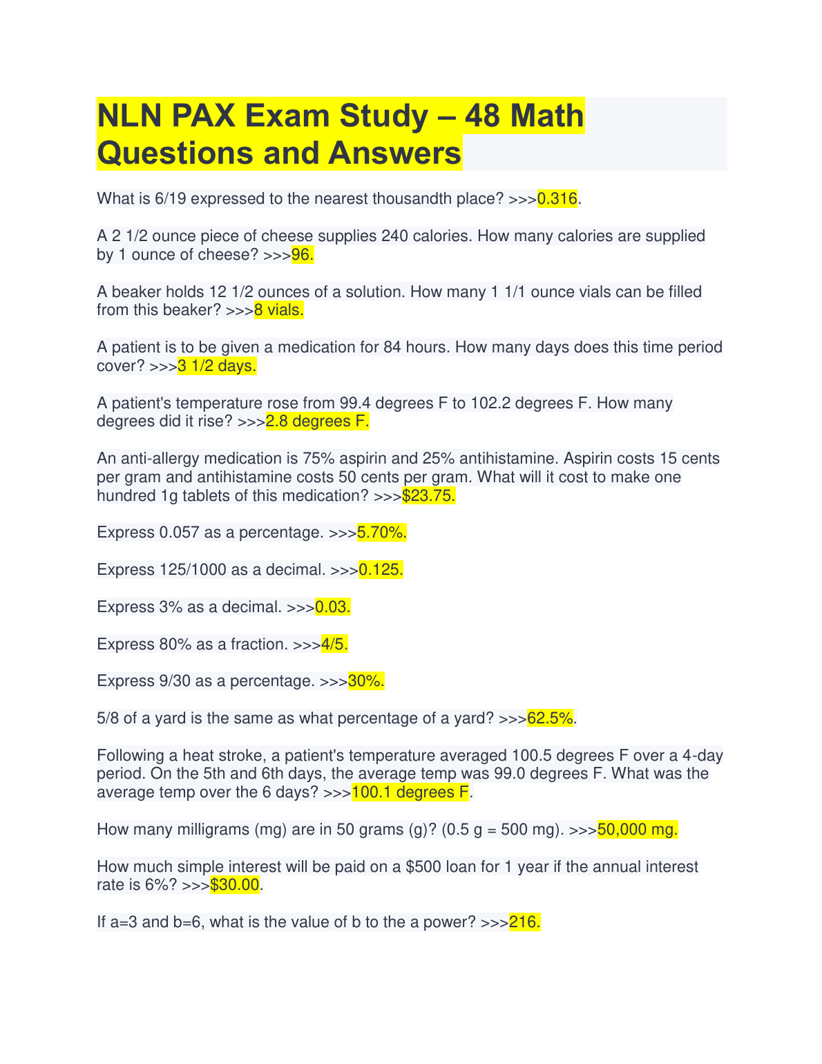 NLN PAX Exam Study 48 Math Questions and Answers 2023/2024. DOWNLOAD on www.fliwy.com INSTANTLY.