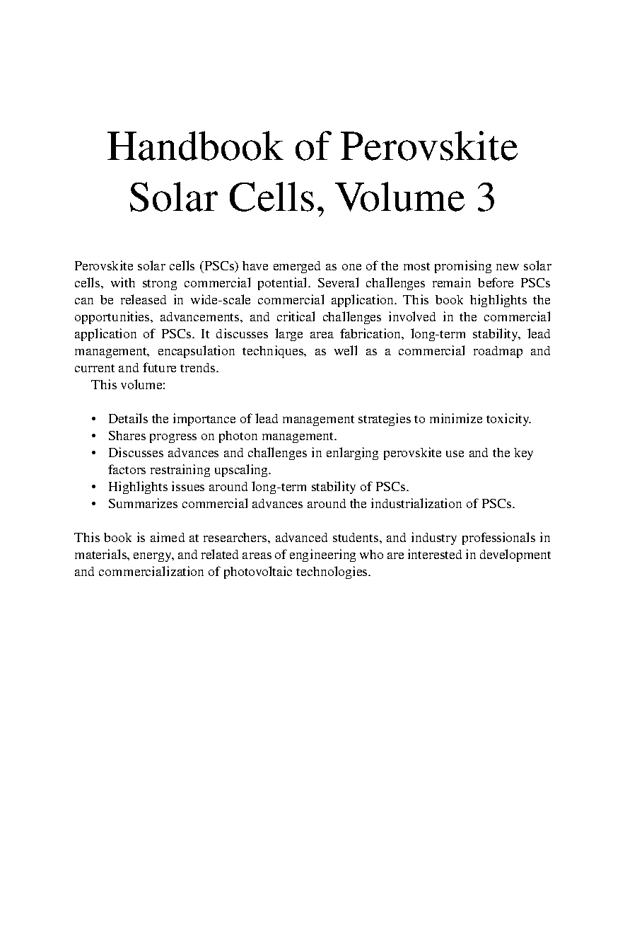 Handbook of Perovskite Solar Cells, Volume 3: Critical Challenges and Opportunities in Commercialization - Jiangzhao Chen and Sam Zhang (Editors)