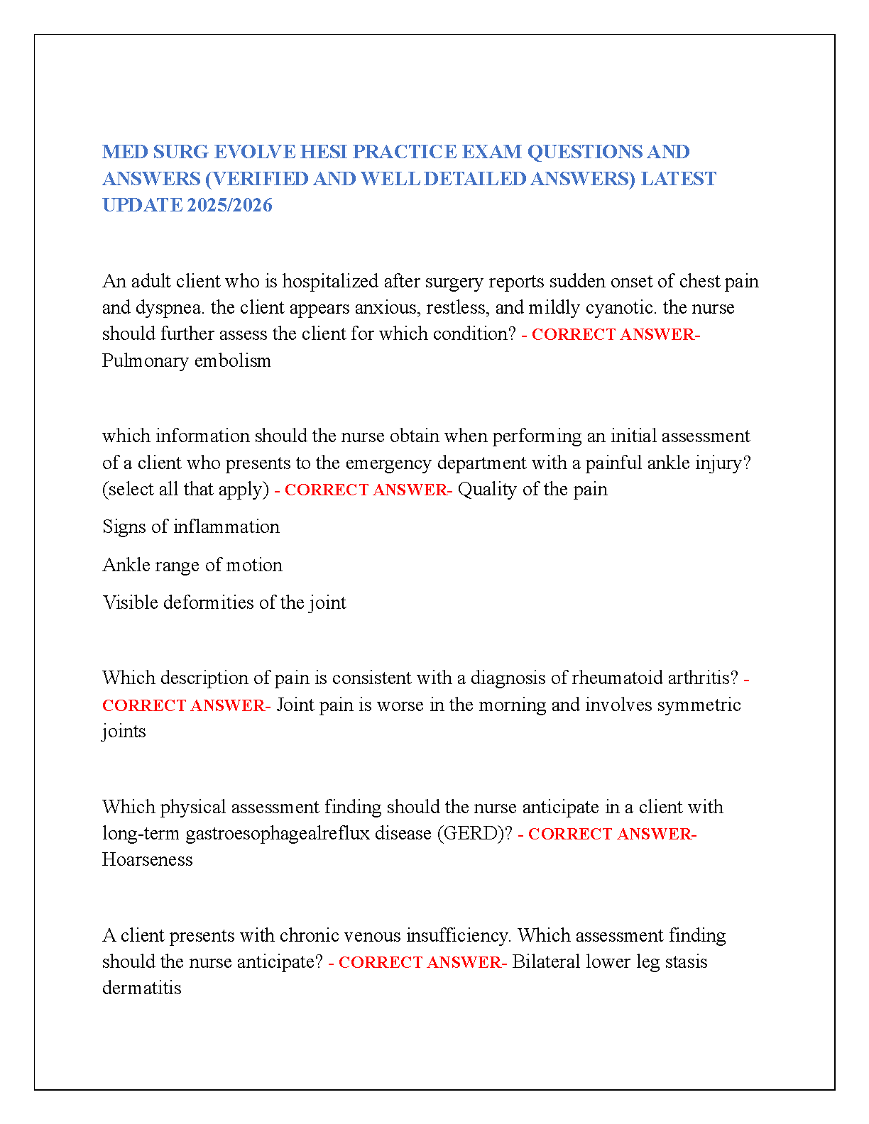 Med-Surg Evolve HESI Practice Exam Questions and Answers (Verified and Well-Detailed Answers) - 2025/2026 Edition
