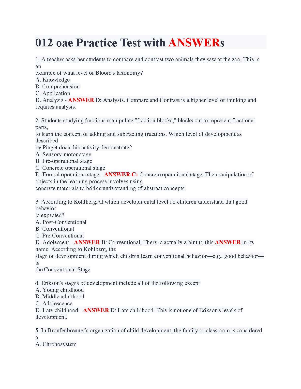 Ace your 012 oae exam with this practice test featuring detailed answers and explanations. This resource is designed to help you master key concepts and improve your understanding of developmental psychology, Bloom's Taxonomy, Piaget's stages, Kohlberg's stages of moral development, and Erikson's stages. Prepare effectively for exam day and increase your chances of passing on the first attempt.
