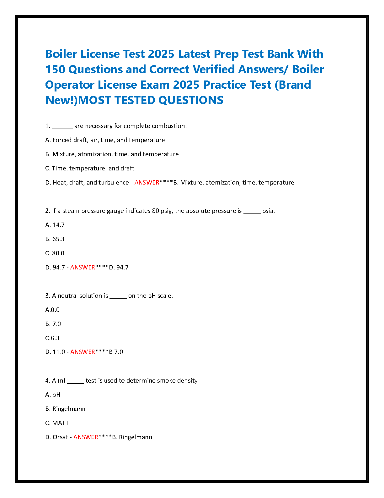 Ace your Boiler Operator License Exam in 2025 with this comprehensive prep test bank. 150 questions with verified answers cover the most tested topics to help you pass on your first try and avoid resits. Get the edge you need with this updated 2025 edition.