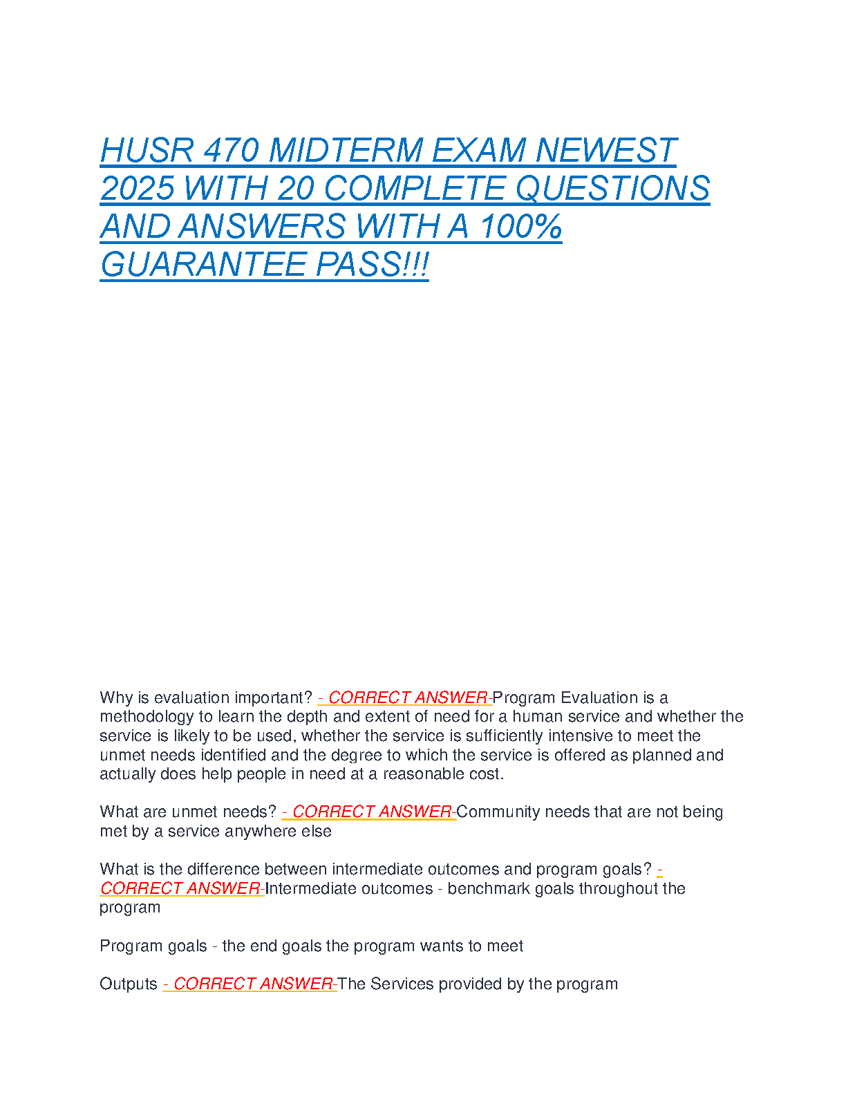 Ace your HUSR 470 Midterm Exam with this comprehensive study guide featuring 20 complete questions and answers. This 2025 edition is designed to help you achieve a 100% score and avoid exam resits. Get the answers you need to succeed!