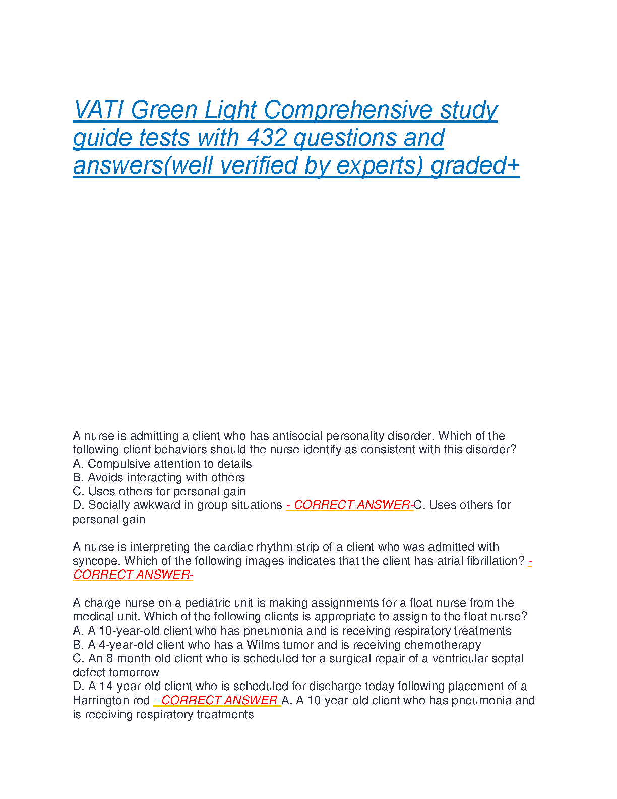 Ace your nursing exams with this comprehensive VATI Green Light study guide featuring 432 expert-verified questions and answers. Designed for the 2024/2025 academic year, this resource helps students master key concepts and avoid resits. Get ready to succeed!