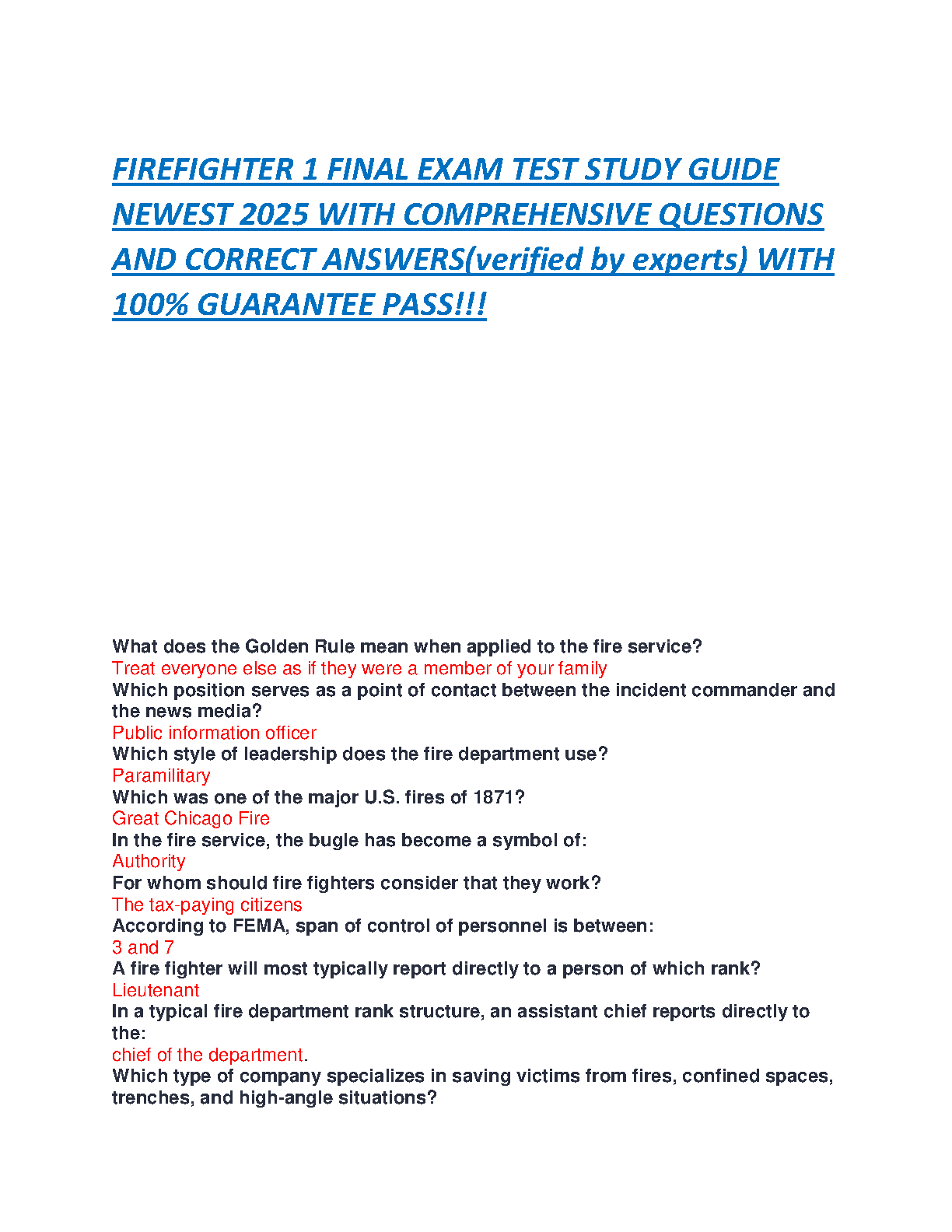 Guaranteed to help you pass your Firefighter 1 final exam on the first attempt! This 2025 edition study guide is packed with comprehensive questions and expert-verified answers, providing complete exam preparation for aspiring firefighters. Avoid resits and boost your confidence with this ultimate study resource.