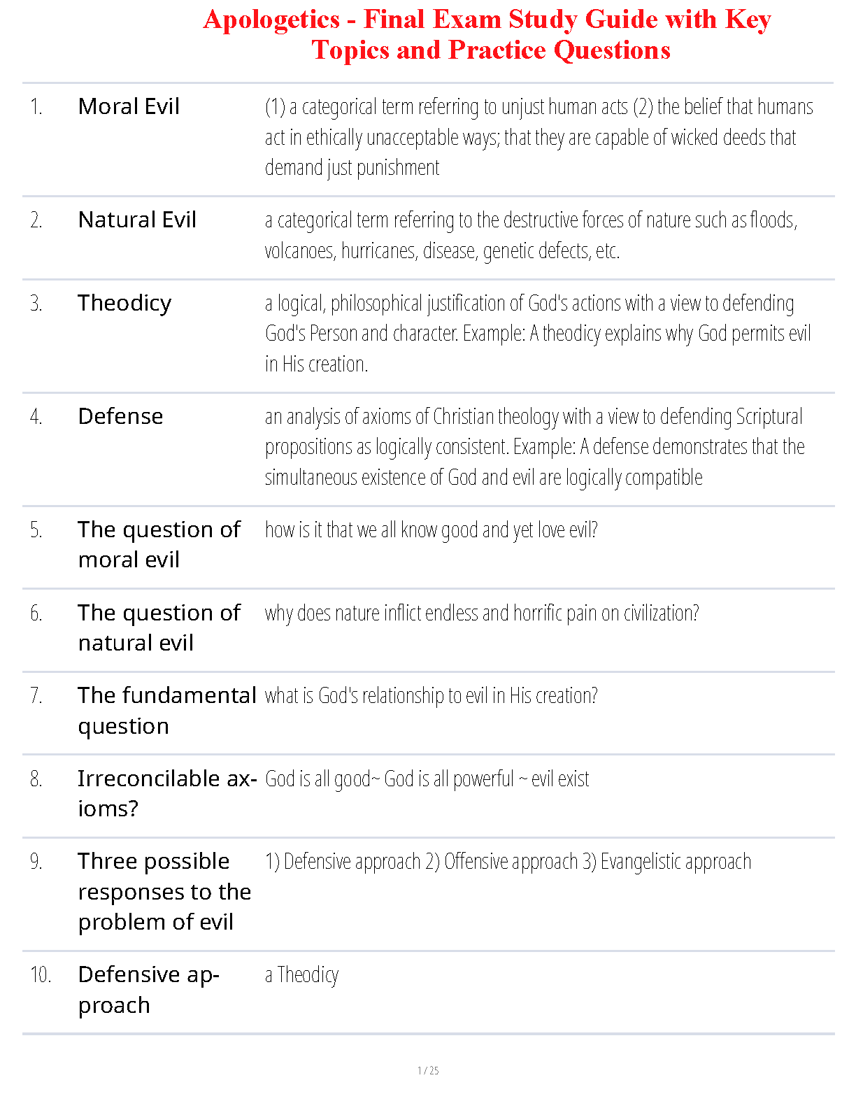 Ace your Apologetics final exam with this comprehensive study guide. This resource provides key concepts, practice questions, and answers, ensuring a thorough understanding of moral evil, natural evil, theodicy, and more. Prepare effectively and avoid resits. Ideal for 2024/2025 academic year.
