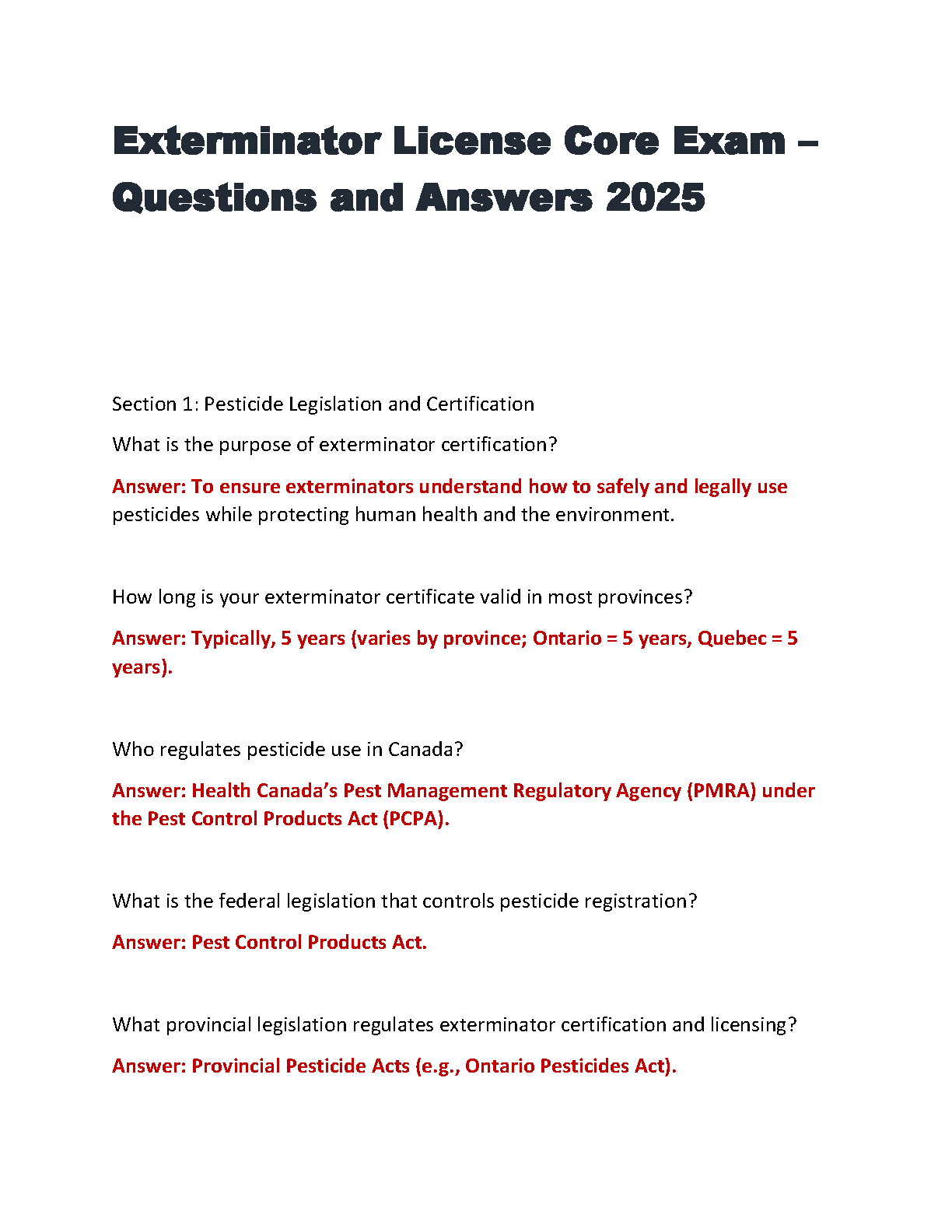 Ace your 2025 Exterminator License Core Exam with this comprehensive question and answer guide. This resource covers key topics in pesticide legislation and certification, ensuring you're fully prepared for exam day. Designed to help you avoid resits and achieve success on your first try!