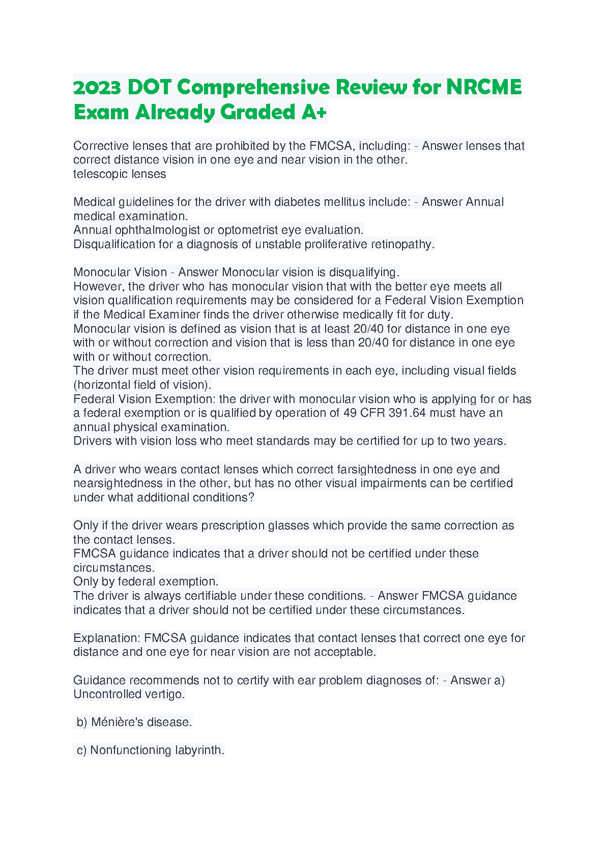 Ace your 2023 DOT NRCME exam on your first attempt with this comprehensive review guide. This A+ graded resource covers key topics including vision requirements, medical guidelines for drivers with diabetes, and disqualifying conditions. Prepare effectively and avoid costly resits!