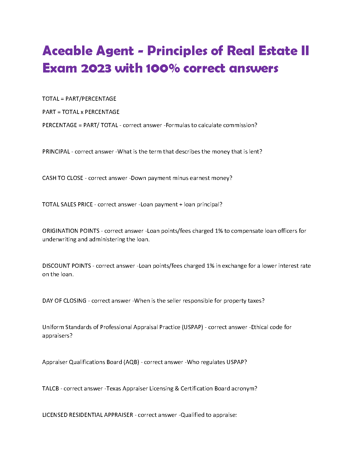 Aceable Agent Principles of Real Estate II Exam 2023 solutions. This resource provides 100% accurate answers to help students pass their exams on the first attempt, mastering key concepts such as calculating commissions, understanding loan terms, and ethical appraisal practices. Prepare effectively and avoid resits!