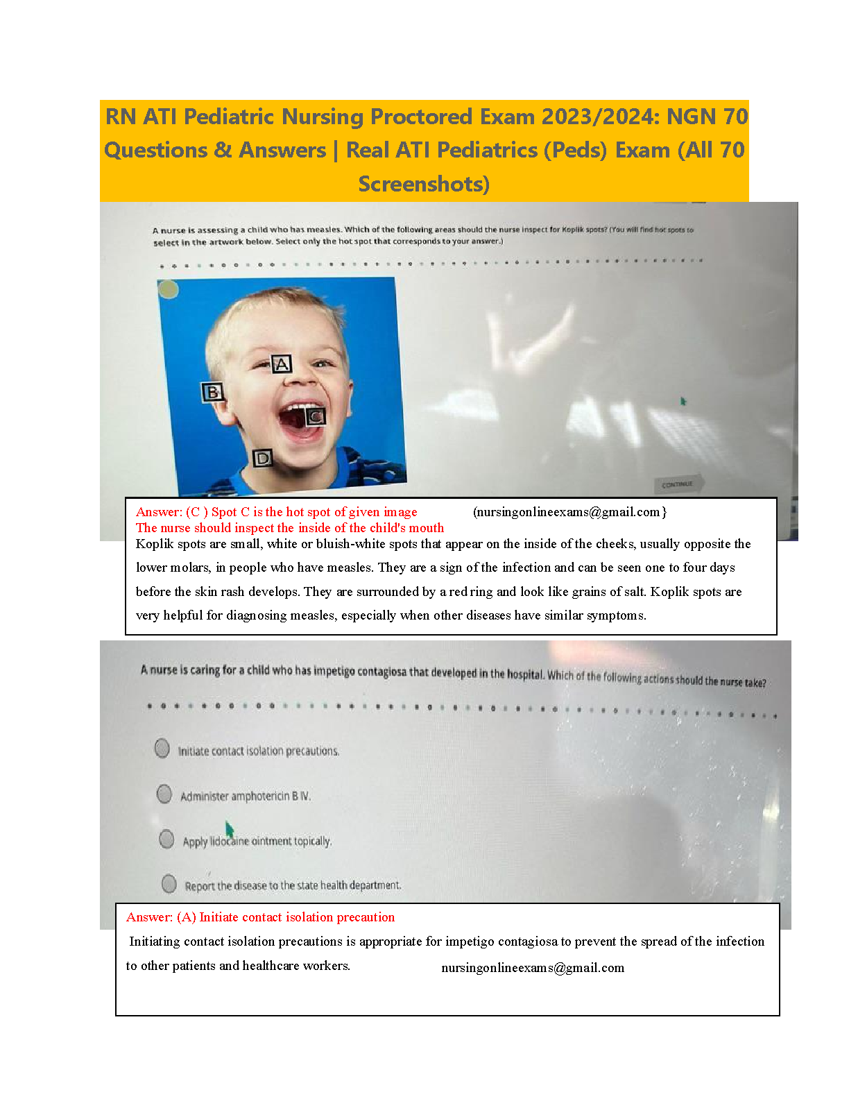 Ace your RN ATI Pediatric Nursing Proctored Exam (NGN 70) with this comprehensive guide featuring 70 real ATI Pediatrics exam screenshots and detailed answers. This resource is designed to help you pass on your first attempt, eliminating the need for resits. Prepare effectively for the 2024/2025 academic year.