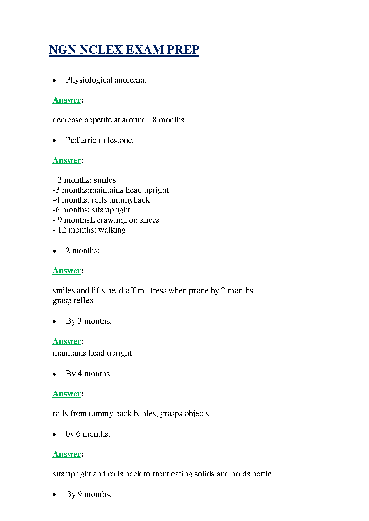 Ace your NCLEX exam on your first try with this ultimate study guide, covering key pediatric milestones and physiological anorexia. Prepare for success and avoid resits with this expertly curated resource for the 2024-2025 academic year.