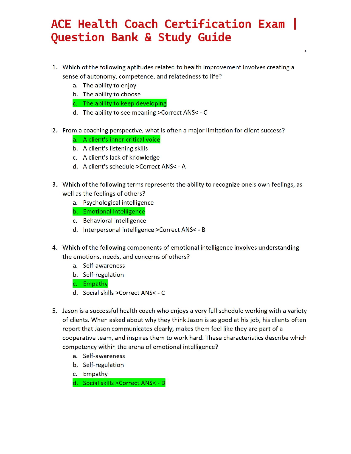Ace your ACE Health Coach Certification exam with this comprehensive question bank and study guide. Designed to help you master the material and pass your exam on your first try, this resource covers key concepts related to health improvement, coaching perspectives, emotional intelligence, and more. Prepare effectively and avoid costly resits.