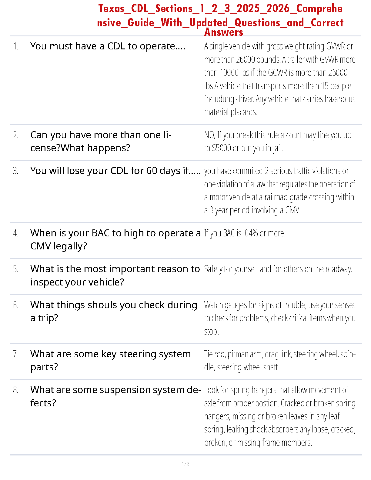 Texas CDL Sections 1, 2, & 3 (2025-2026): Comprehensive Guide with Updated Questions and Answers