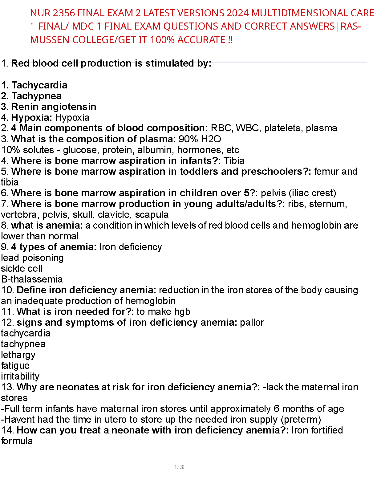 Ace your NUR 2356 Final Exam with this comprehensive study guide featuring the latest 2024 exam questions and accurate answers for Rasmussen College students. Get 100% accuracy and avoid resits! This resource covers key topics including blood composition, bone marrow aspiration, iron deficiency anemia, and neonatal iron deficiency. Prepare effectively and pass your exam on the first try.