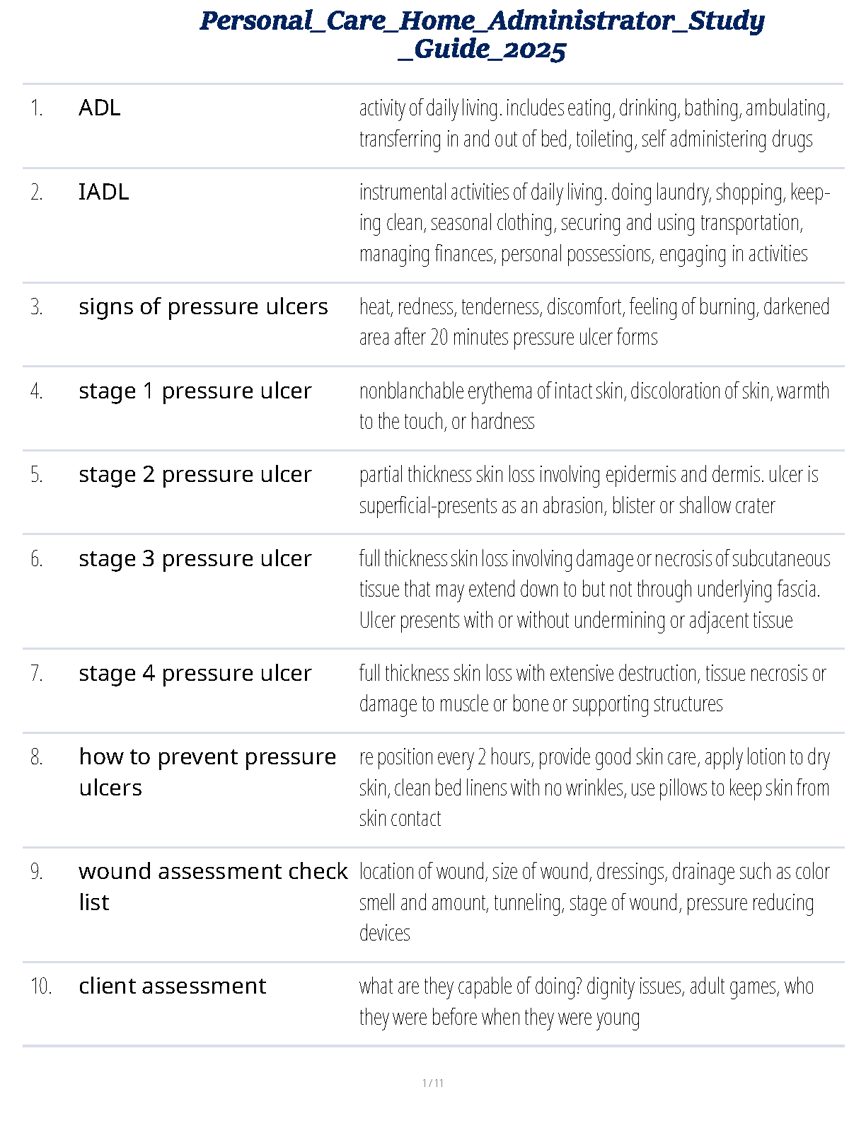 Ace your Personal Care Home Administrator exams with this comprehensive 2025 study guide. This resource covers key concepts like ADLs, IADLs, pressure ulcer stages, wound assessment, and client assessment. Designed to help you avoid resits and achieve exam success.