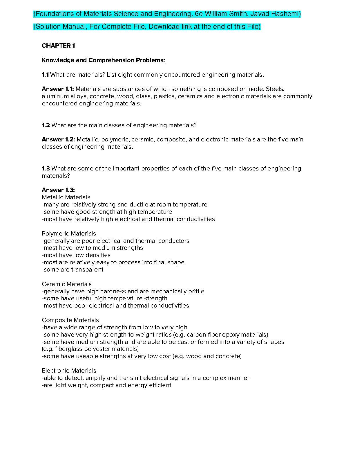 Foundations of Materials Science and Engineering, 6th Edition Solution Manual by William Smith and Javad Hashemi