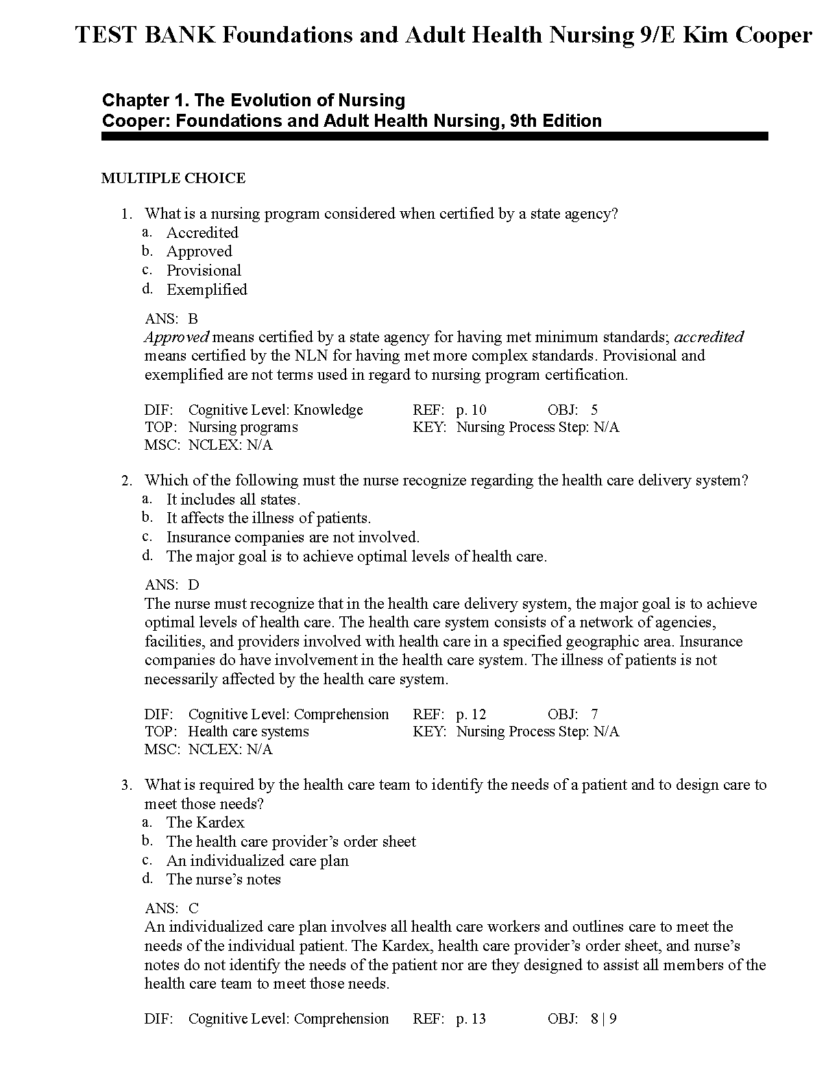 Test Bank for Foundations and Adult Health Nursing, 9th Edition by Kim Cooper