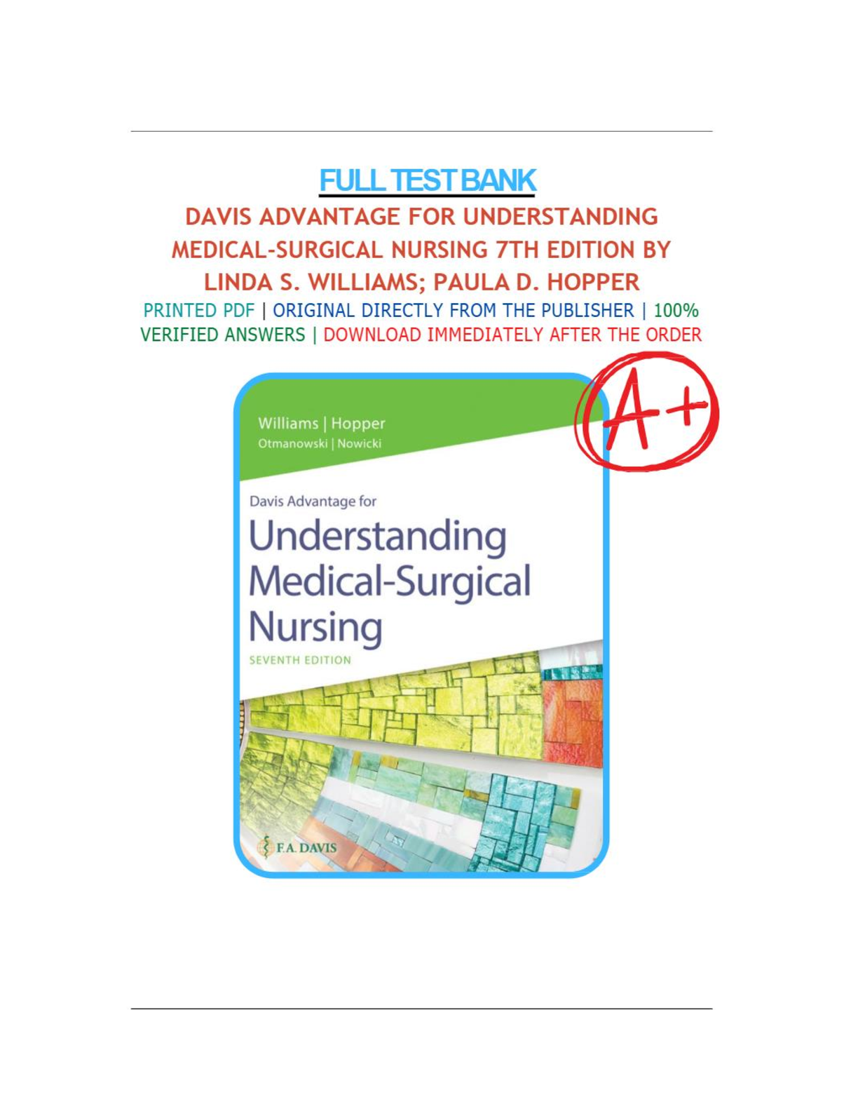 Ace your medical-surgical nursing exams with this complete test bank for the 7th edition of Davis Advantage for Understanding Medical-Surgical Nursing by Linda S. Williams, Paula D. Hopper, Diane M. Otmanowski, and Mary Ann Nowicki. This 100% verified resource, printed directly from the publisher, provides comprehensive coverage of all exam topics, ensuring first-attempt success and preventing resits. Download immediately after purchase.