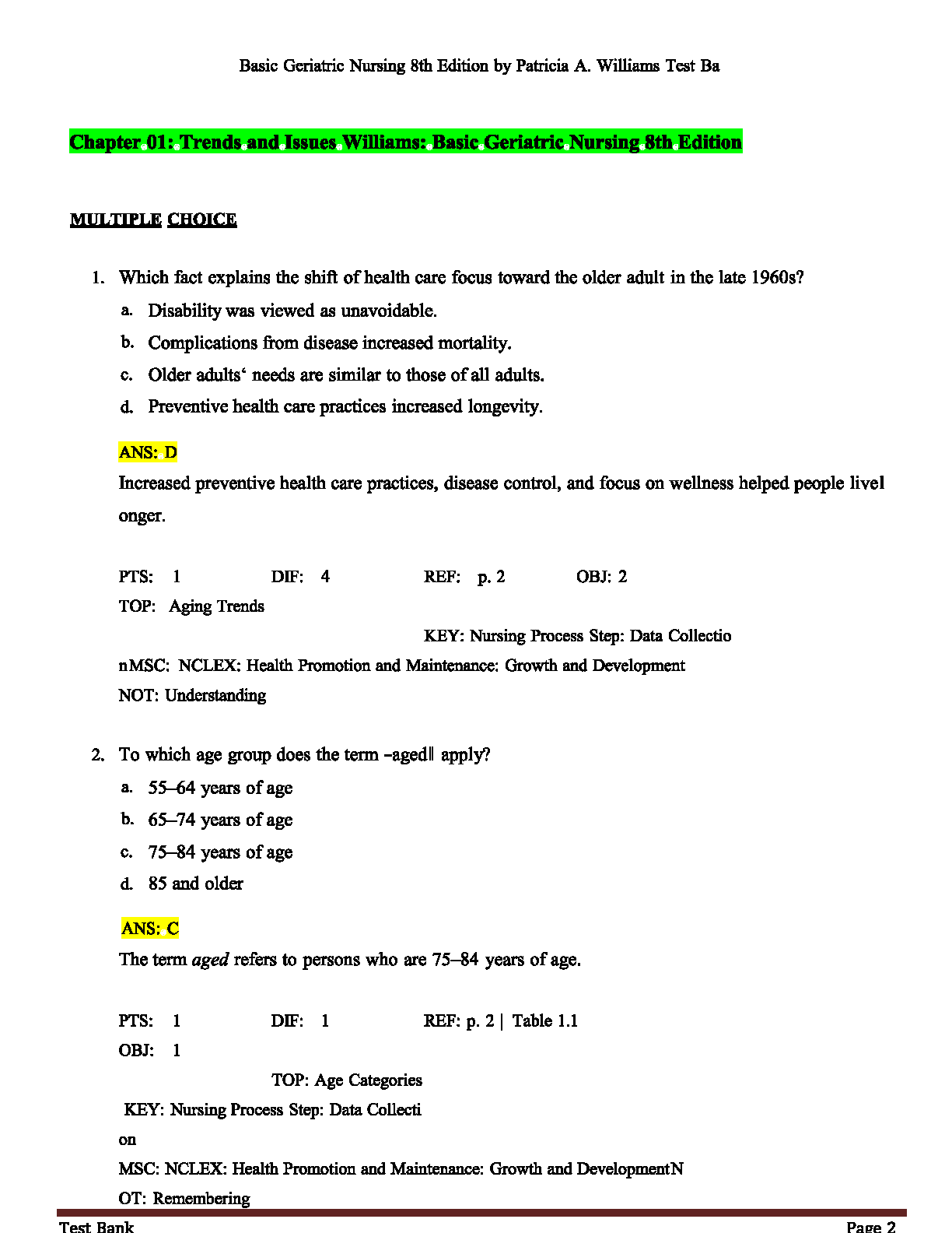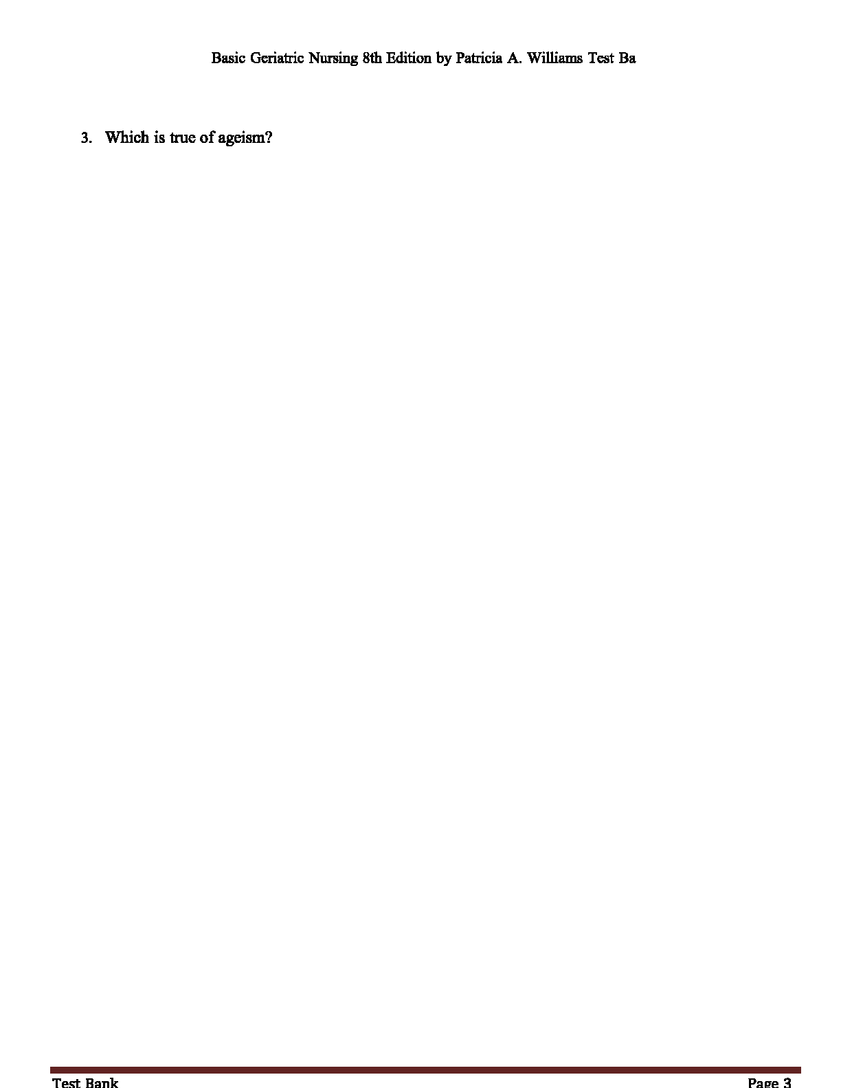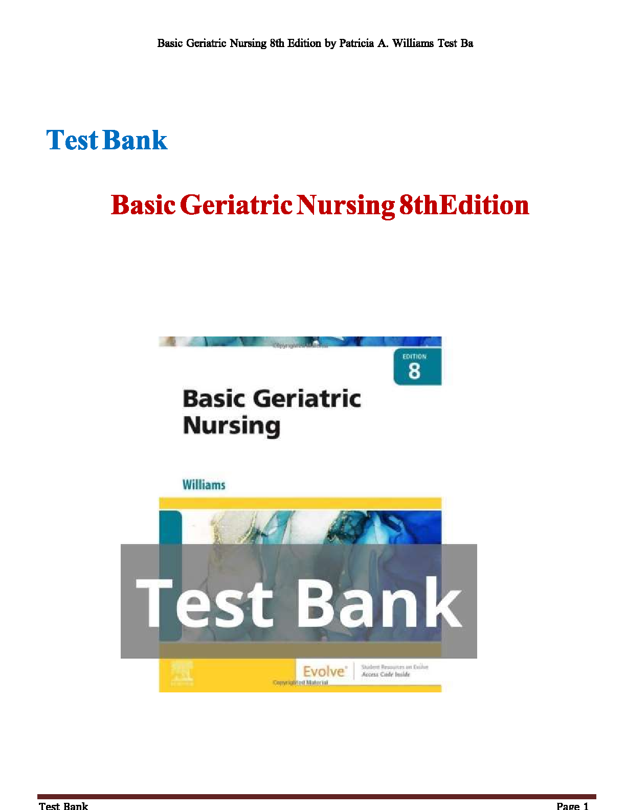 Prepare for success in your geriatric nursing course with this comprehensive test bank for Patricia A. Williams' Basic Geriatric Nursing, 8th Edition. This resource offers a wide range of questions mirroring exam styles, ensuring first-attempt exam success and avoiding resits. Master key concepts and boost your confidence before the exam.