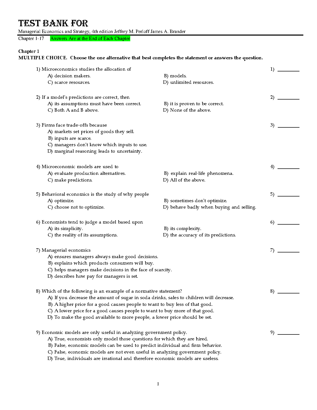 Test Bank for Managerial Economics and Strategy, 4th Edition by Jeffrey M. Perloff and James A. Brander