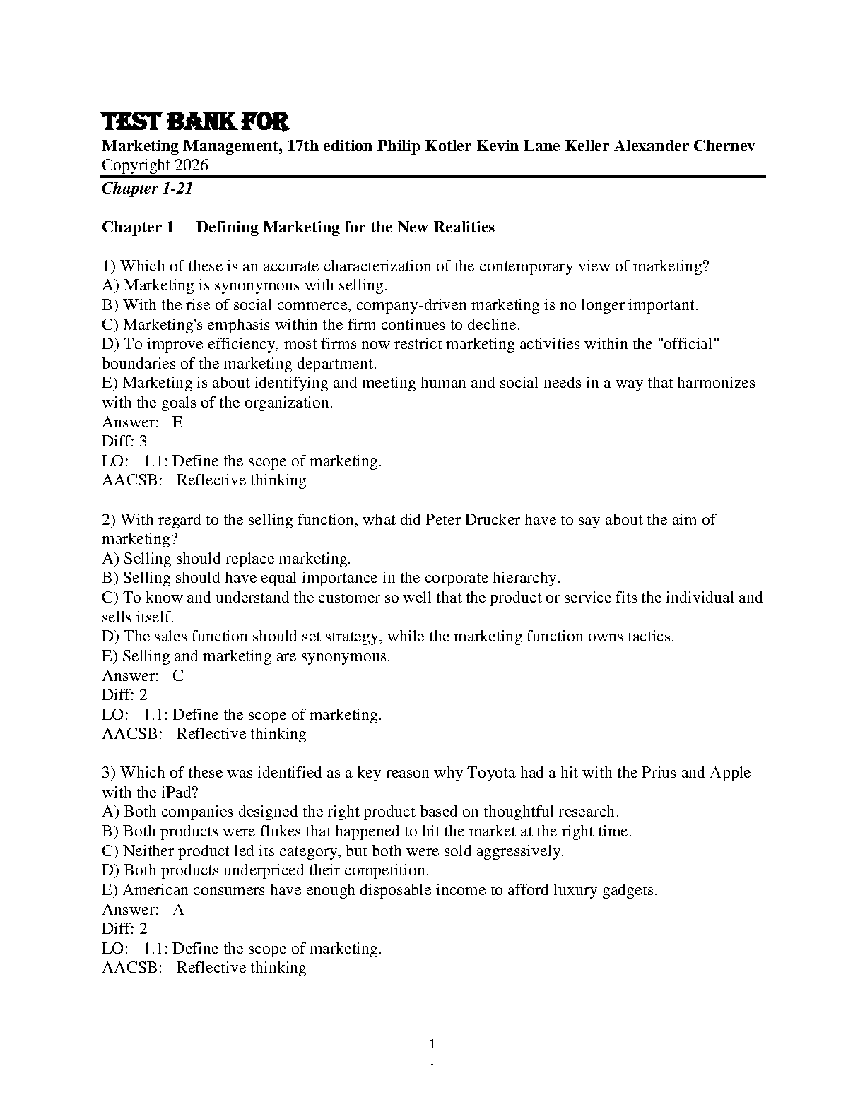 Ace your Marketing Management exams with this comprehensive test bank for the 17th edition by Kotler, Keller, and Chernev. Prepare effectively and avoid resits with detailed questions and answers covering key concepts. Perfect for students aiming for first-attempt success in the 2024/2025 academic year.