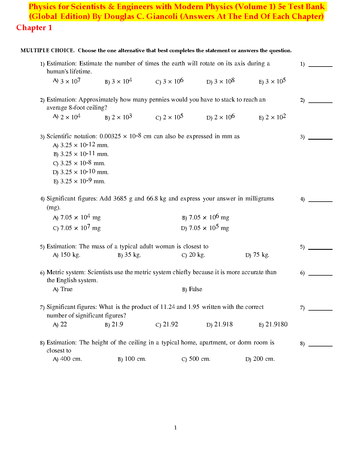 Physics for Scientists and Engineers with Modern Physics (Volume 1) 5th Edition Test Bank by Douglas C. Giancoli