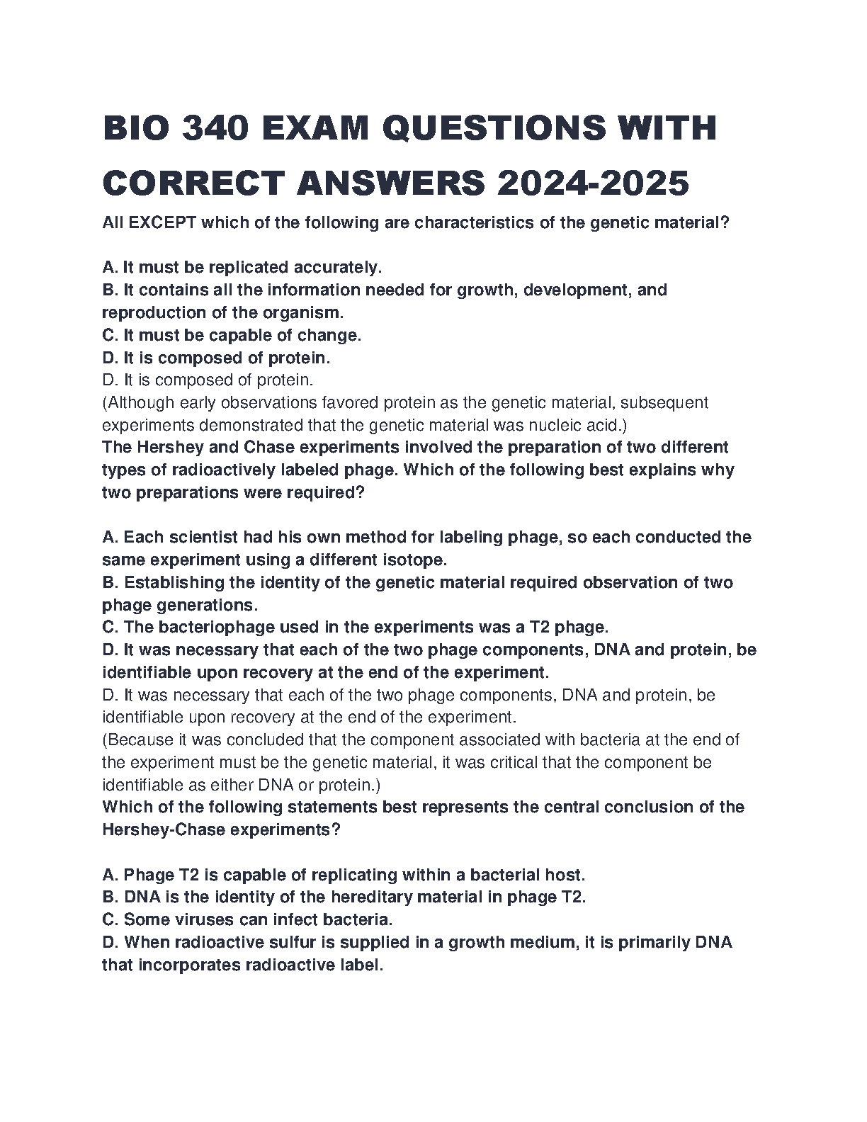 This comprehensive BIO 340 exam prep resource for the 2024-2025 academic year provides accurate answers to key exam questions. Designed to help students master the material and pass their exams with confidence, avoiding resits. This resource covers crucial topics like the Hershey-Chase experiment and characteristics of genetic material, ensuring thorough exam preparation.