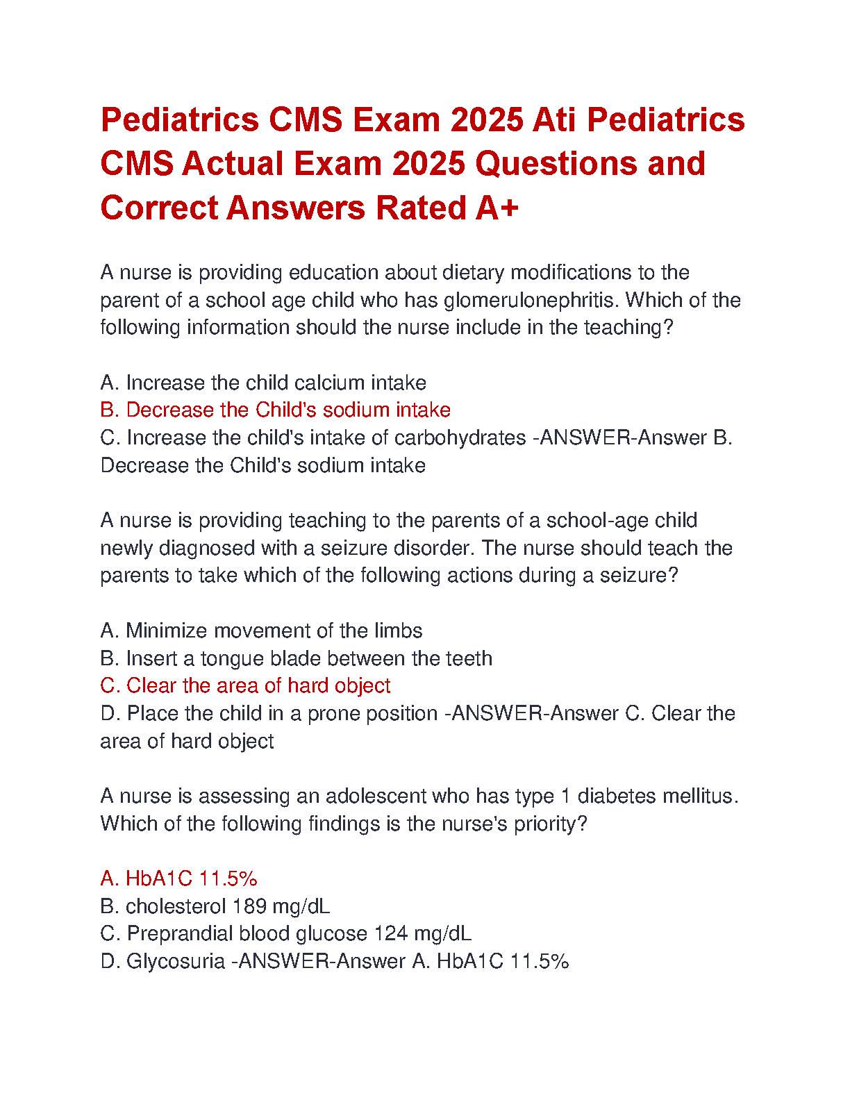 Ace your Ati Pediatrics CMS Exam with this comprehensive study guide featuring 2025 exam questions and answers. Our expertly curated content helps you avoid resits and pass on your first attempt. Ideal for students preparing for the 2024/2025 academic year.