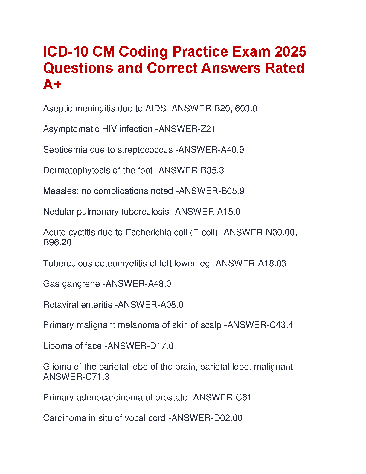 Ace your ICD-10-CM coding exam with this comprehensive practice exam for the 2024/2025 academic year. This A+ rated resource features questions and answers, designed to help students pass their exams on the first attempt and avoid resits. Prepare thoroughly and confidently for success!