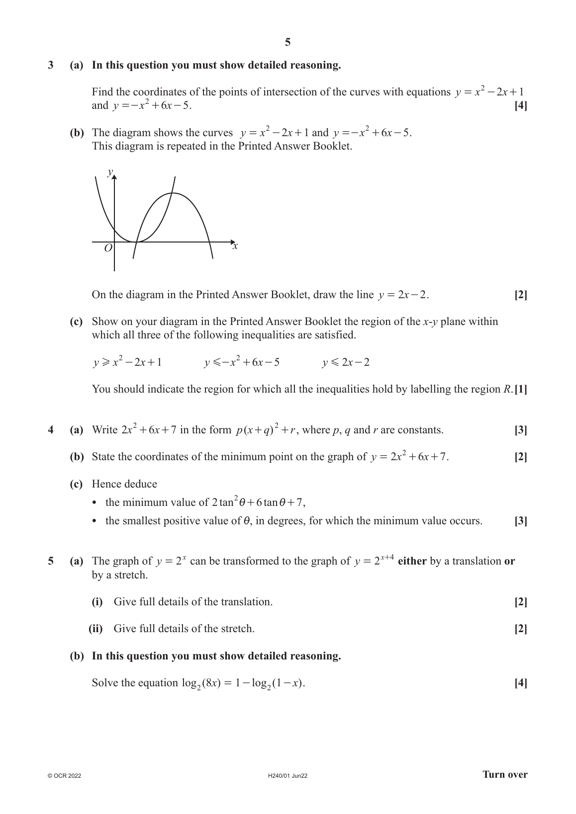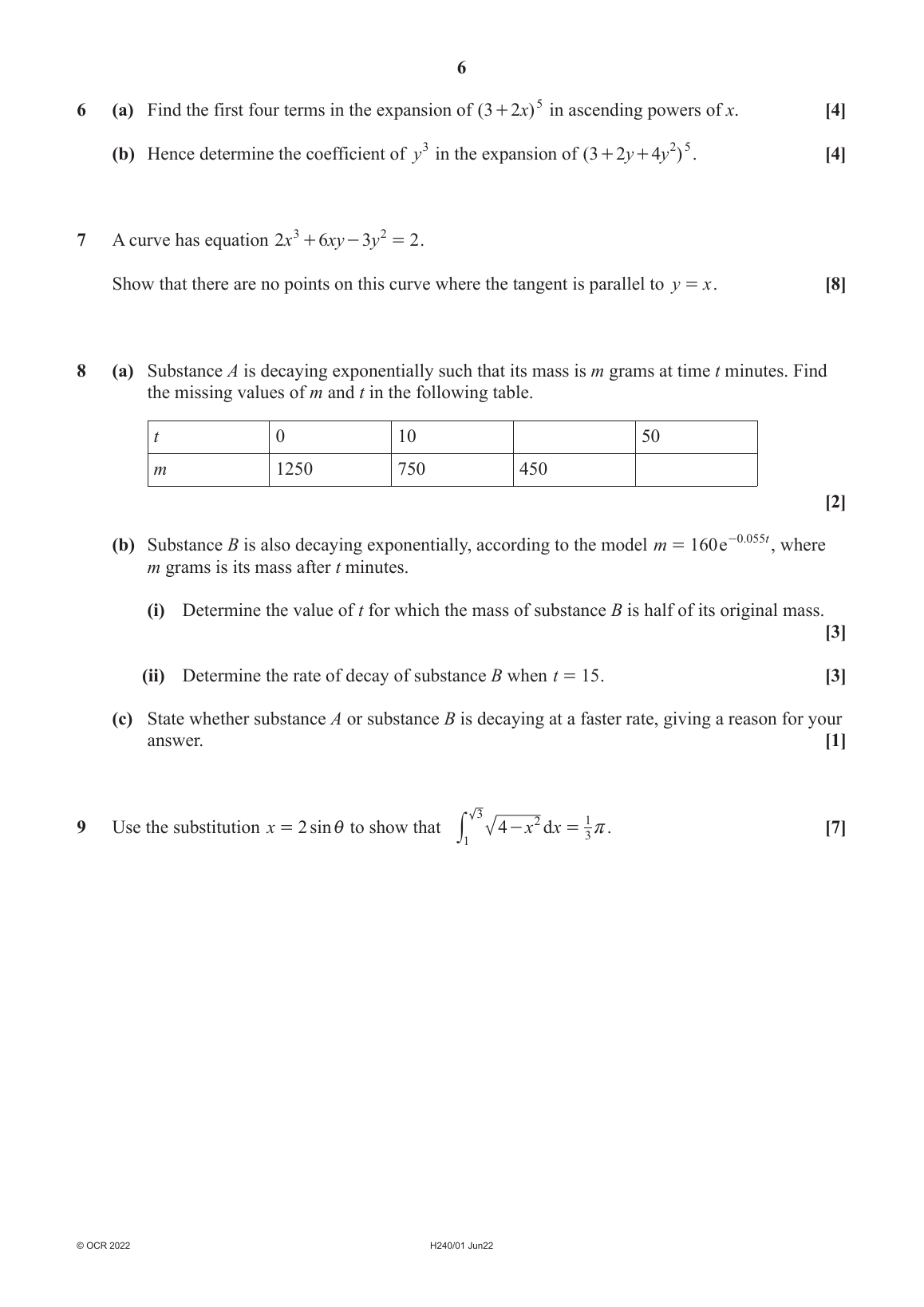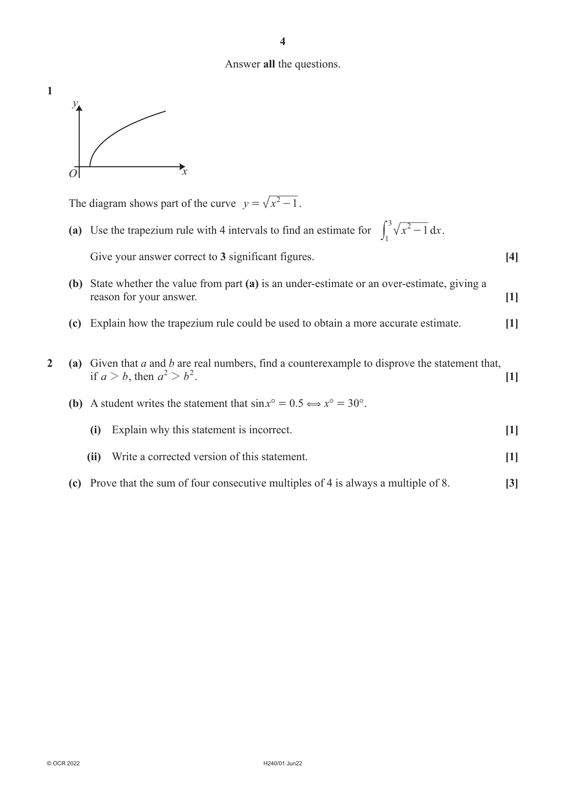 OCR A LEVEL MATHEMATICS A PAPER 1 JUNE 2022 QUESTION PAPER (H240/01: Pure Mathematics)