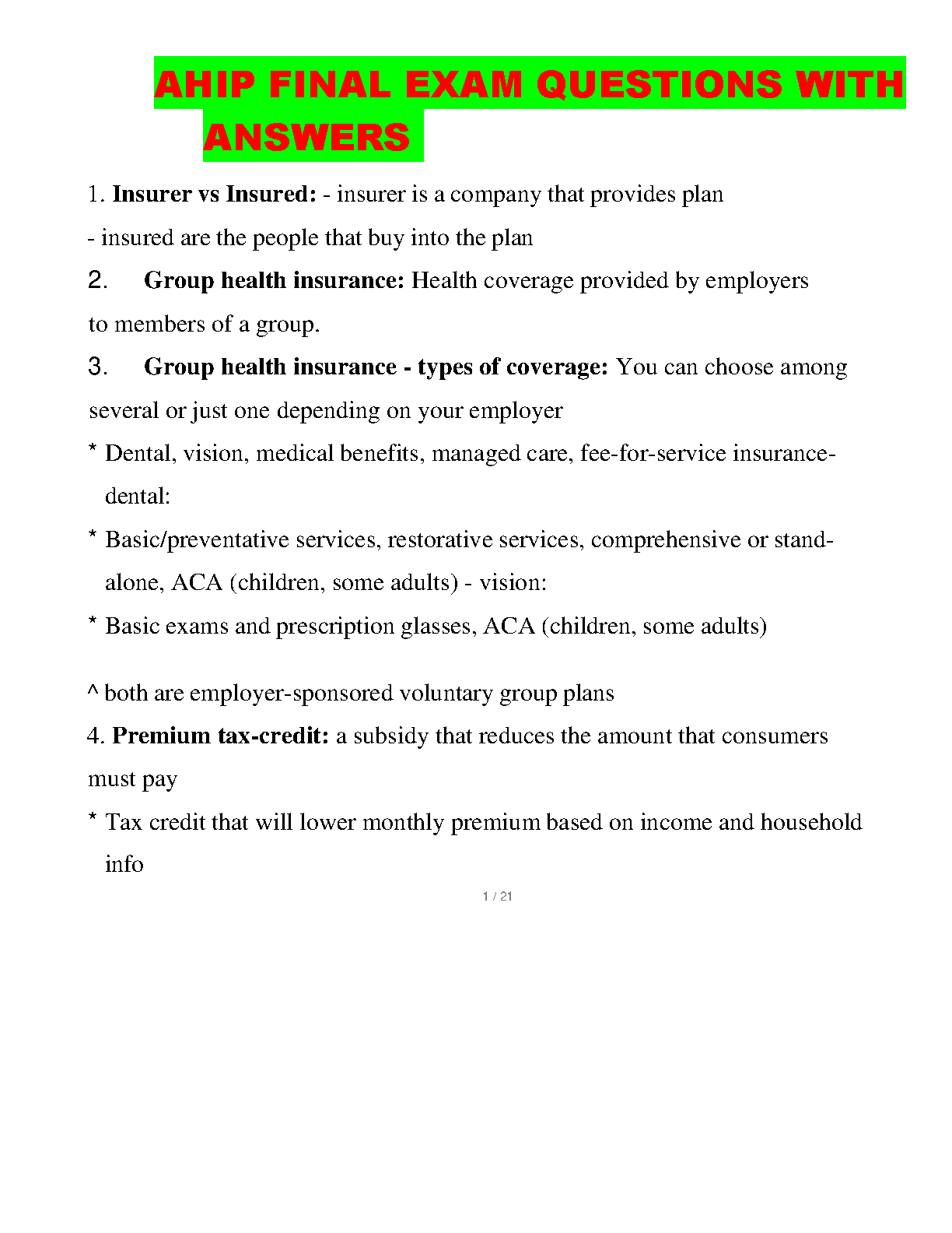 Ace your AHIP final exam with this comprehensive resource. This guide covers key concepts including insurer vs. insured, group health insurance types, and premium tax credits. Designed to help students master the material and avoid exam resits.