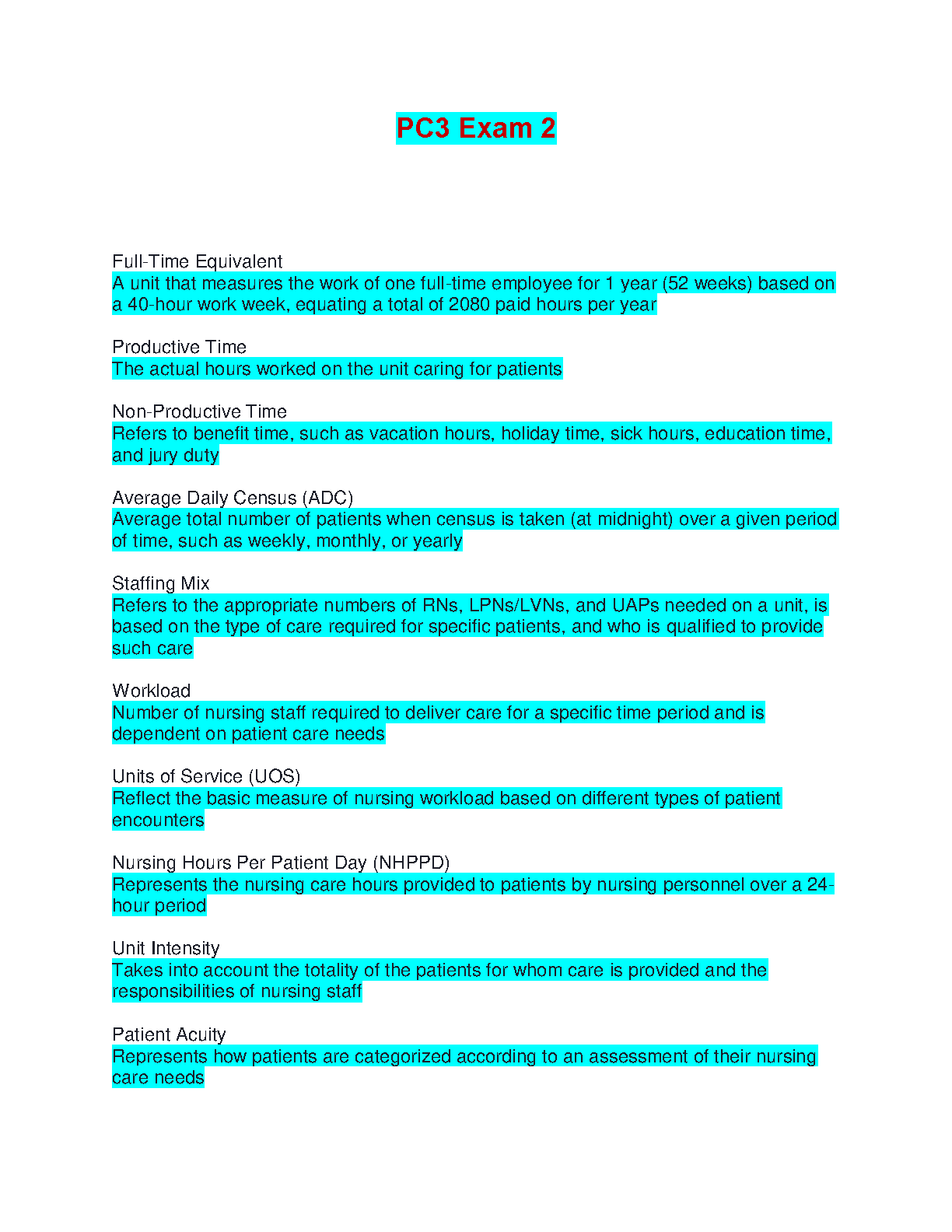 Ace your PC3 Exam 2 with this comprehensive study guide. This resource covers key concepts like Full-Time Equivalents (FTEs), productive and non-productive time, average daily census (ADC), staffing mix, workload, units of service (UOS), nursing hours per patient day (NHPPD), unit intensity, and patient acuity. Prepare effectively and confidently for your exam, maximizing your chances of passing on the first attempt.